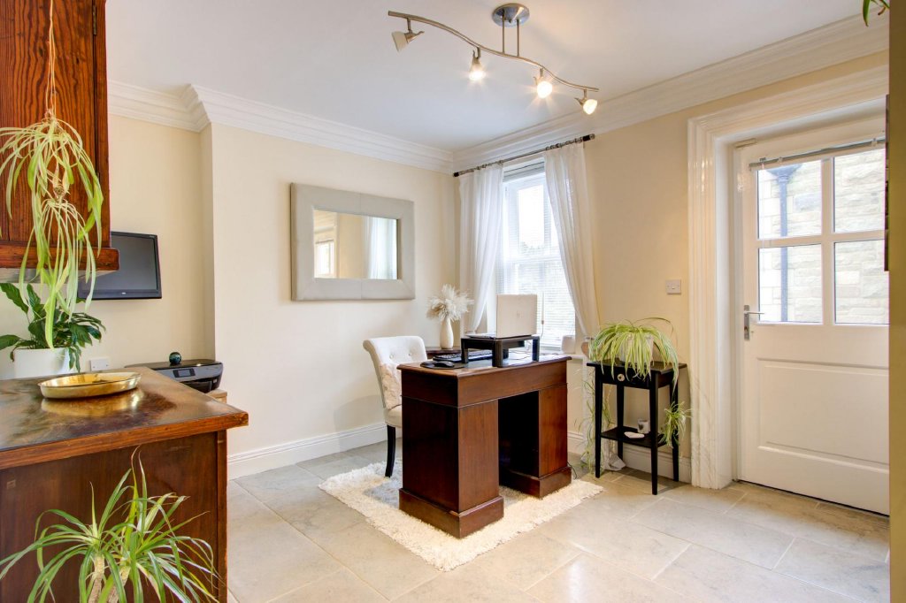 The generous sitting room is a real highlight, with dual-aspect windows, rich parquet flooring and a beautiful fireplace. French doors open directly onto the rear garden, seamlessly connecting inside and out. For more formal occasions, there’s a refined dining room, perfect for hosting guests and family get-togethers. A dedicated study provides quiet focus for those working from home.