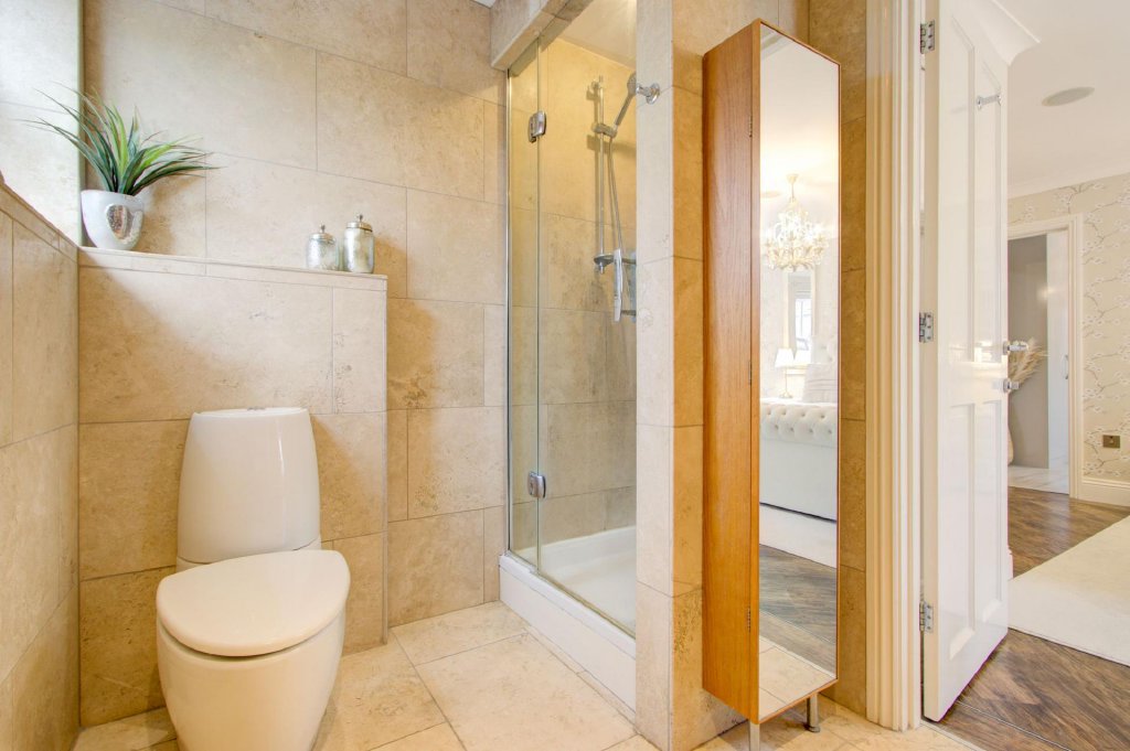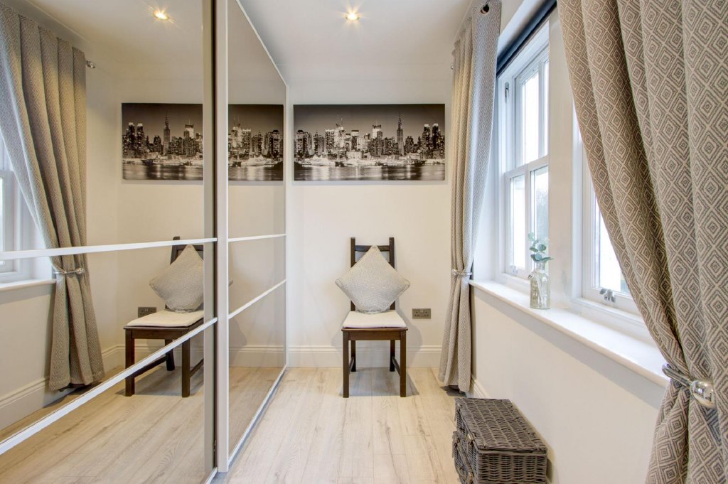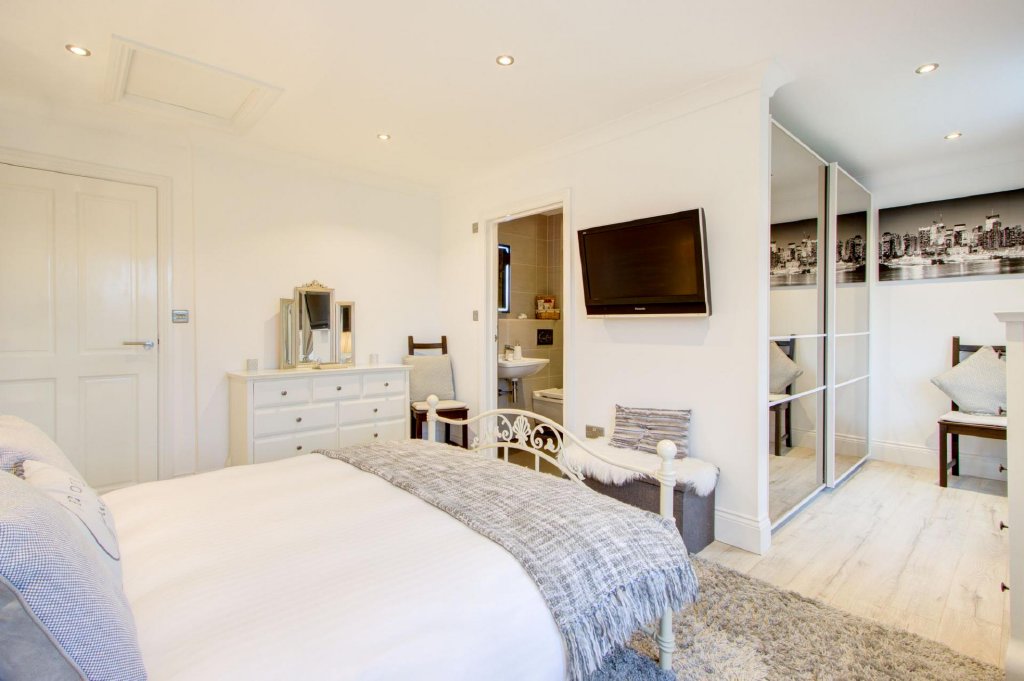 A secondary staircase leads to a fifth en-suite bedroom with extensive built-in storage. With its own private entrance, this wing of the house could easily become a self-contained annexe by adding a kitchen in the current utility space. Planning permission is already in place to extend further, offering additional scope for multi-generational living or luxury guest accommodation.