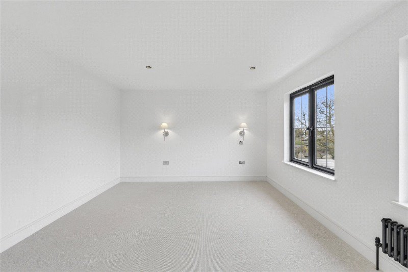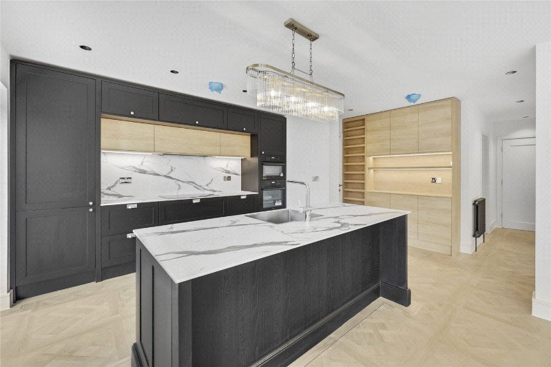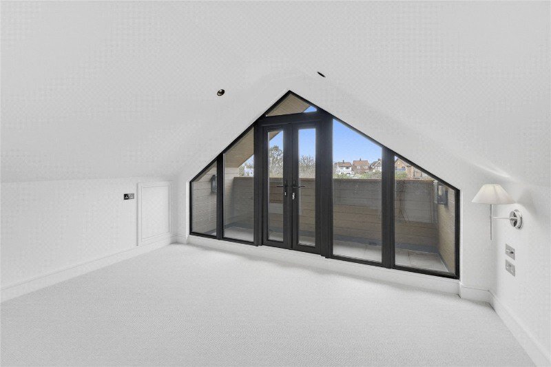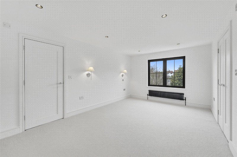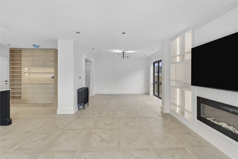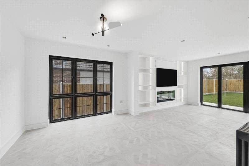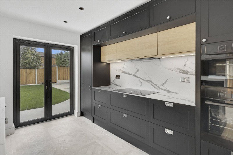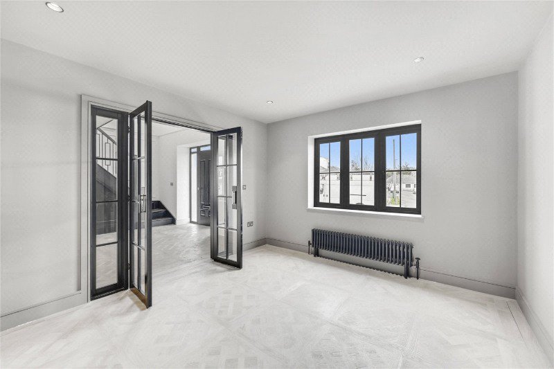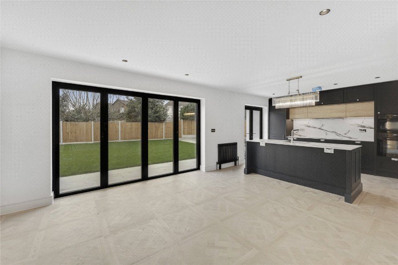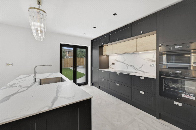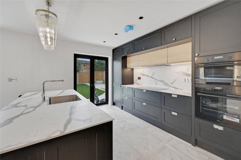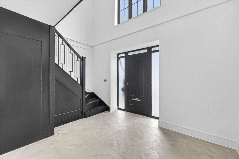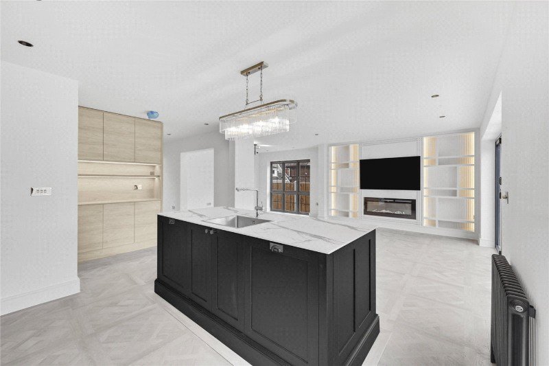 Inside, a double-height vaulted hallway with a sculptural French chandelier sets the tone for the refined interior. A black crittall-style door leads to the front room, while bespoke joinery, including a handcrafted LED-lit media wall, elevates the living spaces.