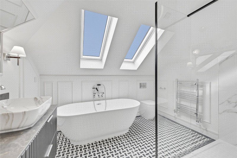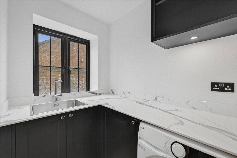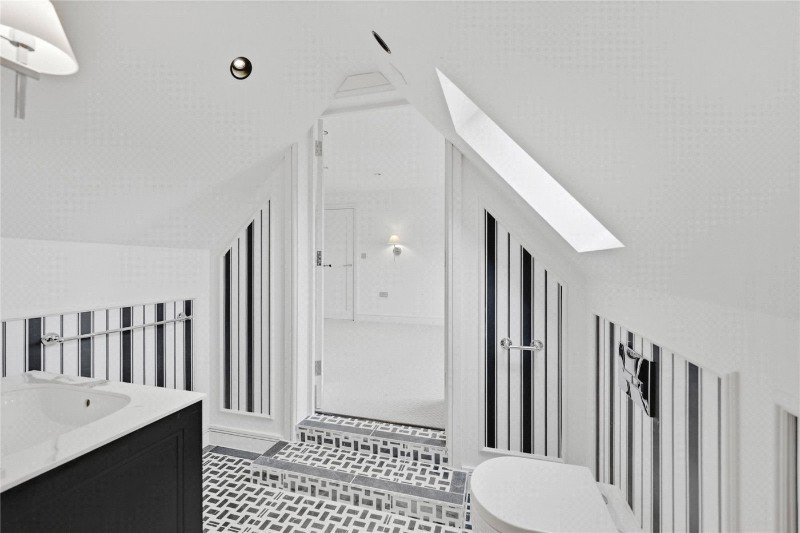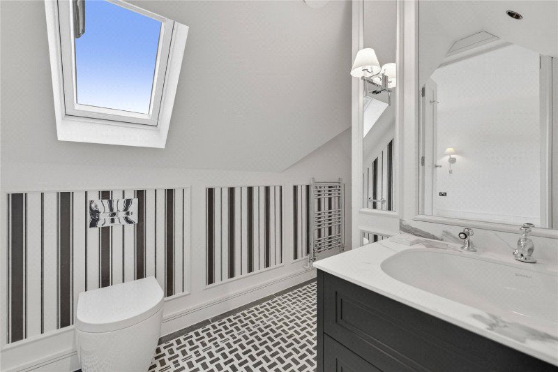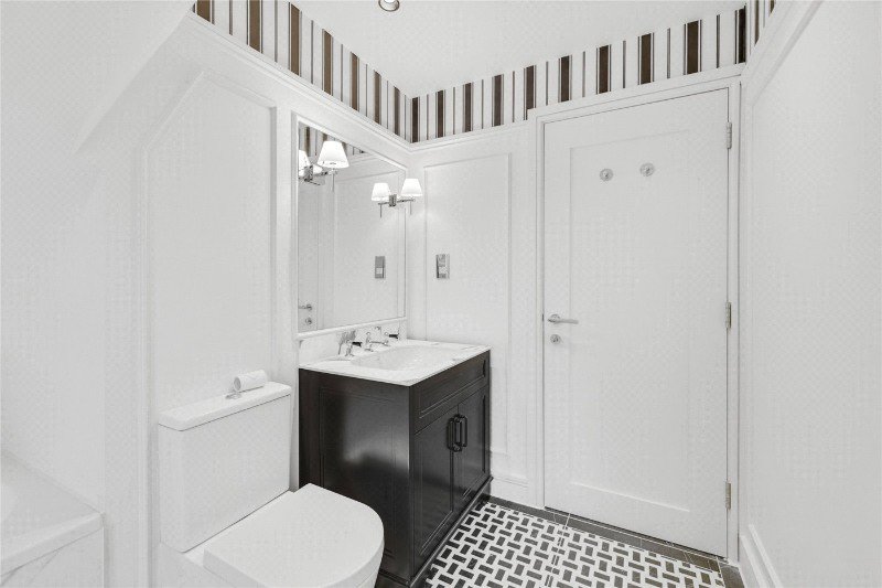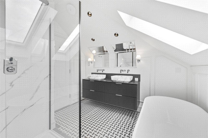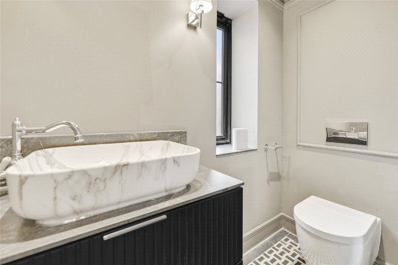 Bathrooms are finished with woven marble-effect Italian porcelain tiles (Astral Bold Weave + Poetry Apuano), luxury brassware, designer vanities, and both the family and master bathrooms offer a freestanding bath and separate walk-in shower. The downstairs WC features Ralph Lauren wallpaper and a black fluted vanity.