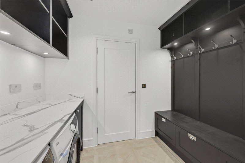 The custom KBD kitchen features Aldana Cannon Black cabinetry, Marble Veneto compact laminate worktops, oak accents, polished nickel handles, AEG appliances (including a combi microwave & grill), and a large central island with an Abode Matrix R15 sink. A separate oak breakfast bar/coffee area adds warmth and practicality. The boot room includes bespoke storage, bench seating, and freestanding AEG washer and dryer.