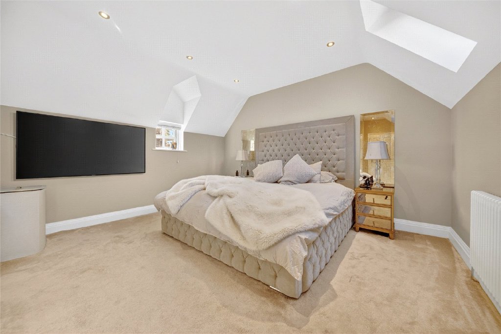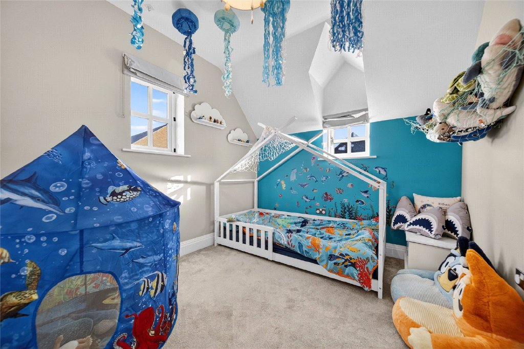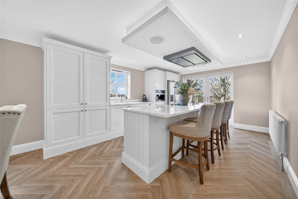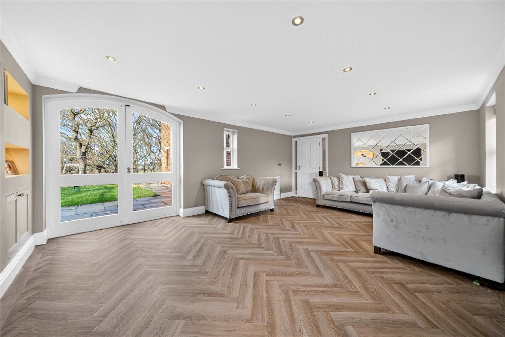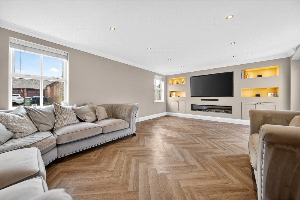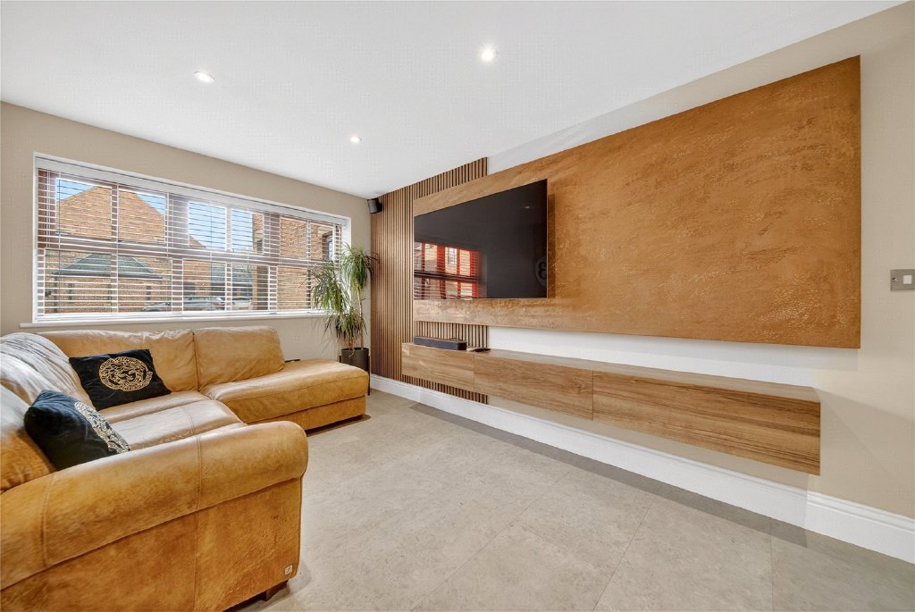 The living room is bright and inviting, flooded with natural light and offering further access to the garden. In addition, part of the garage has been cleverly converted to form a versatile second reception room, currently used as a home office and family space, though equally suited to a playroom, snug or gym.