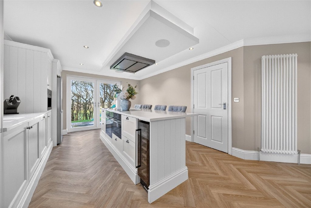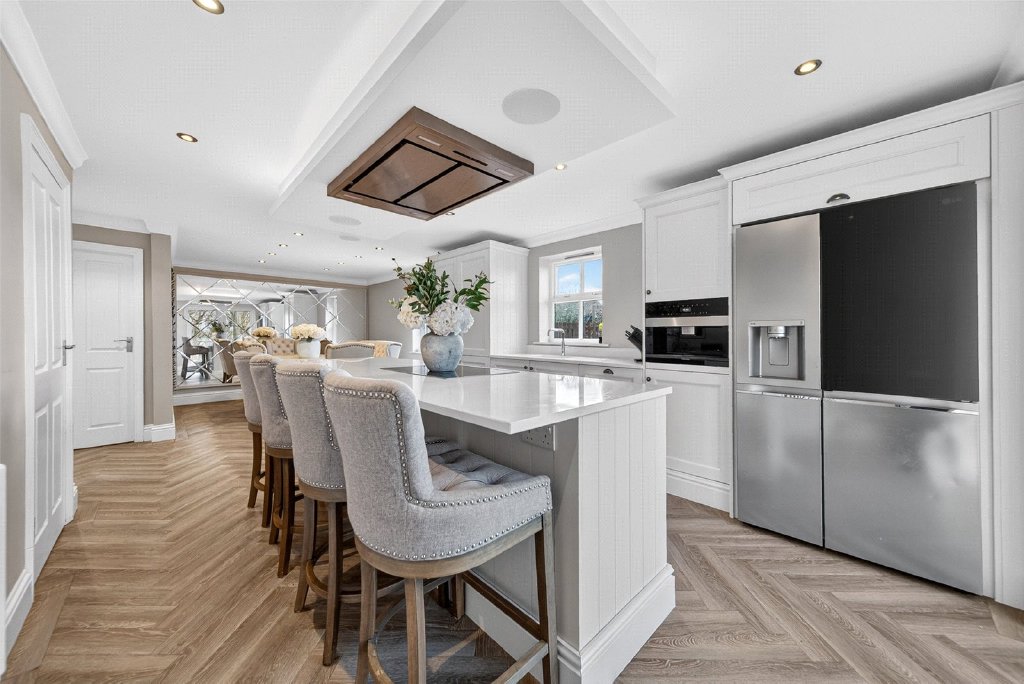 The welcoming entrance hall provides access to both the living room and the open-plan dining kitchen, along with a practical ground floor W.C. The heart of the home is undoubtedly the stunning kitchen — thoughtfully designed and finished with high-quality wall and base units complemented by Quartz worktops. A comprehensive range of premium appliances includes a Quooker tap, Miele oven, grill and microwave, Miele hob, dishwasher, integrated coffee machine, and space for an American-style fridge freezer. Patio doors lead directly out to the rear garden, creating a seamless connection between indoor and outdoor living.