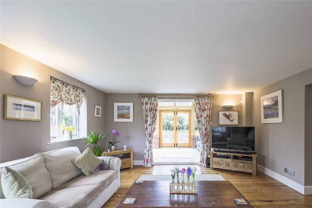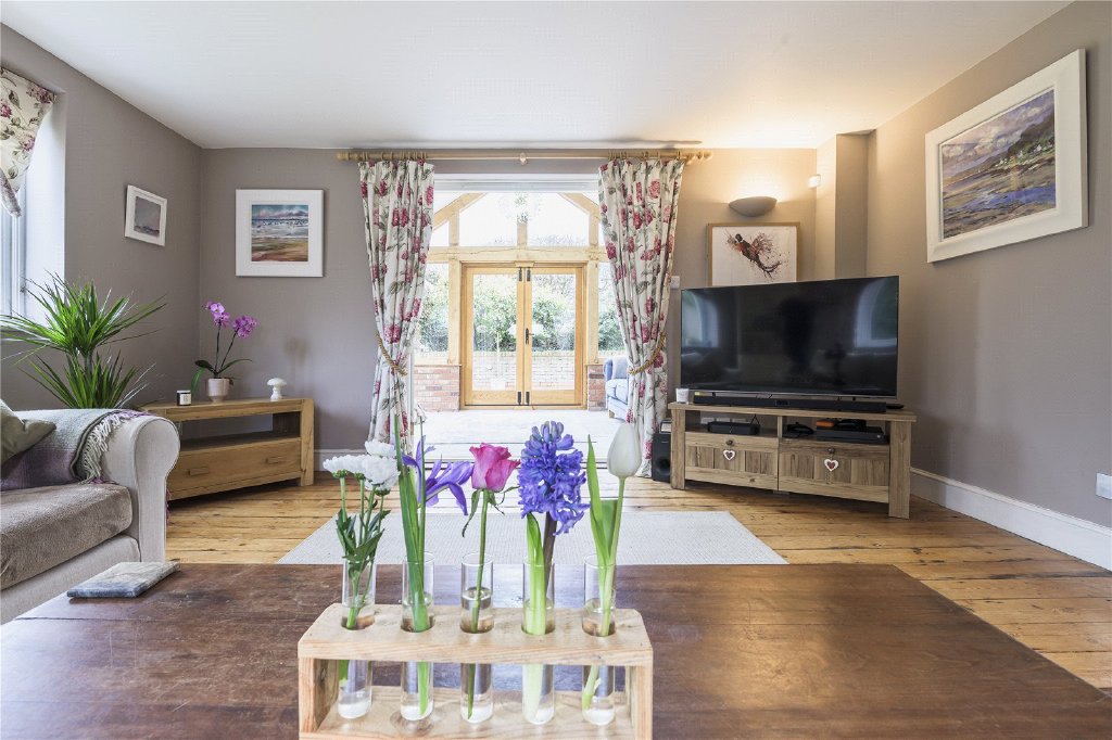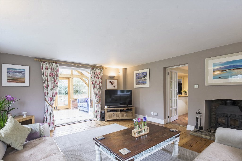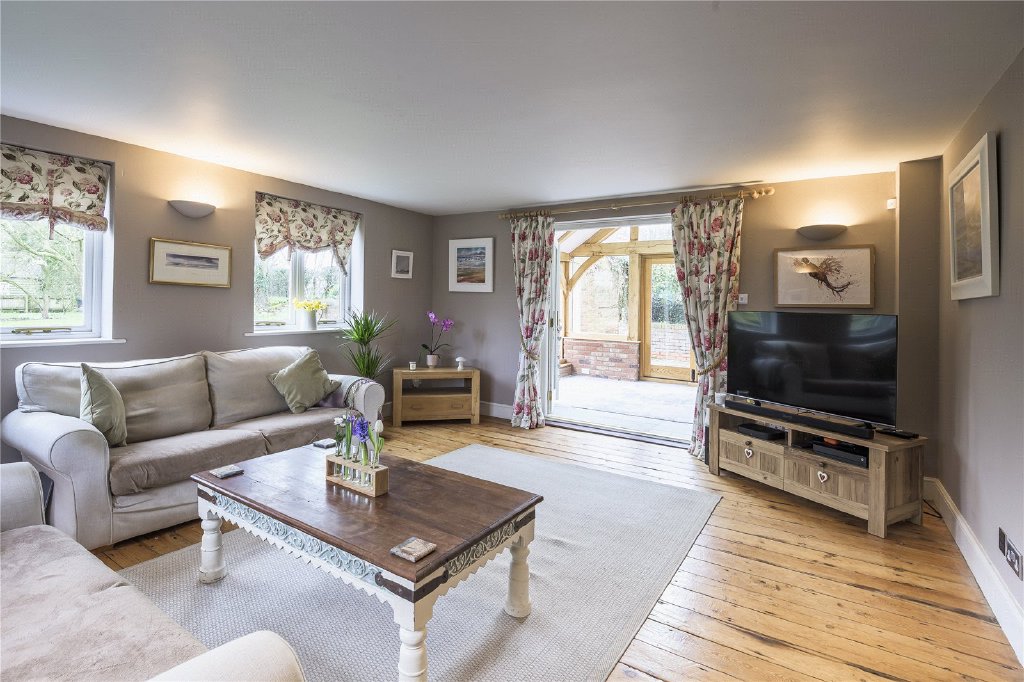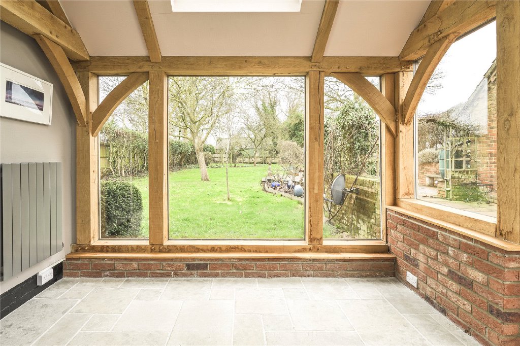 The recently added oak-framed garden room provides a bright and tranquil living space with doors opening to the garden — perfect for relaxing, working from home, or enjoying views across the grounds.