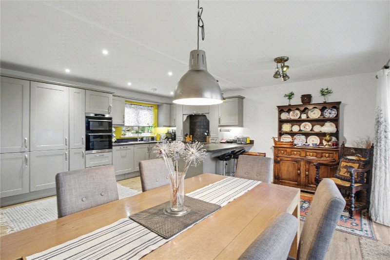 Undoubtedly the heart of the home is the kitchen/dining room — a beautifully light space designed for both everyday living and entertaining. Double doors, flanked by paired windows, open onto the terrace and draw the eye directly to the estuary beyond. A stylish range of shaker-style base and eye-level cabinetry in contemporary grey is complemented by contrasting work surfaces and tiled splashbacks. Integrated appliances include an electric hob, double oven, fridge freezer and dishwasher. There is ample space for a substantial dining table, making this an ideal setting for hosting family and friends against a remarkable coastal backdrop.