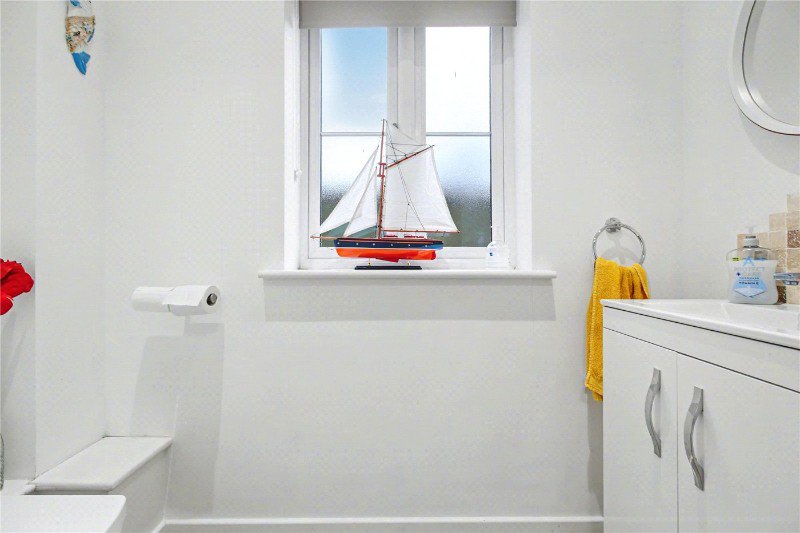 The principal bedroom is a characterful retreat, enhanced by its distinctive saltbox gable design. With commanding estuary views and built-in wardrobes, it offers both charm and practicality. A well-appointed en suite shower room features a large shower cubicle, pedestal basin and WC, again with fully tiled finishes.