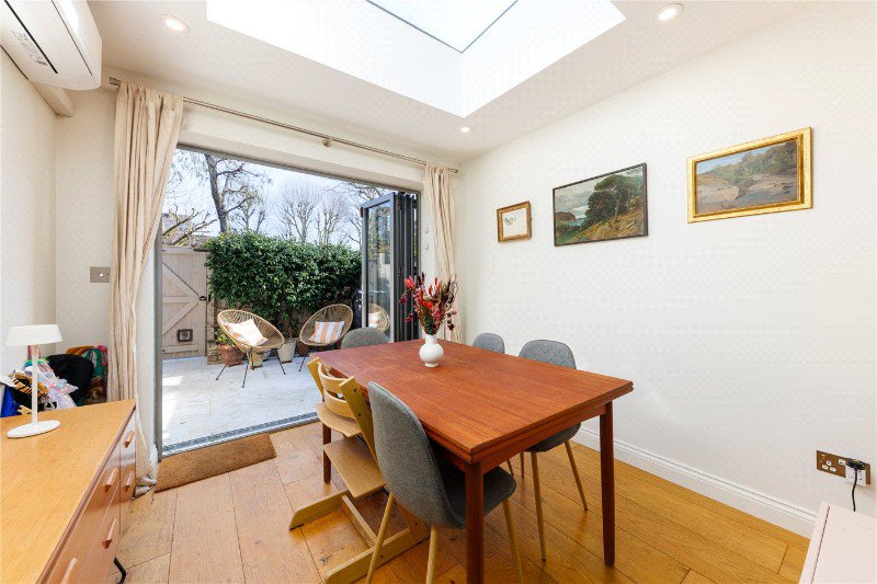 The ground floor has been significantly improved, featuring a front extension that creates a larger, more functional kitchen with excellent storage and preparation space. To the rear, a generous 3-metre extension has transformed the living and dining area into a bright and expansive entertaining space, enhanced by a striking skylight that floods the room with natural light. Bi-fold doors open directly onto an east-facing private garden, ideal for morning sun, outdoor dining, and family enjoyment.