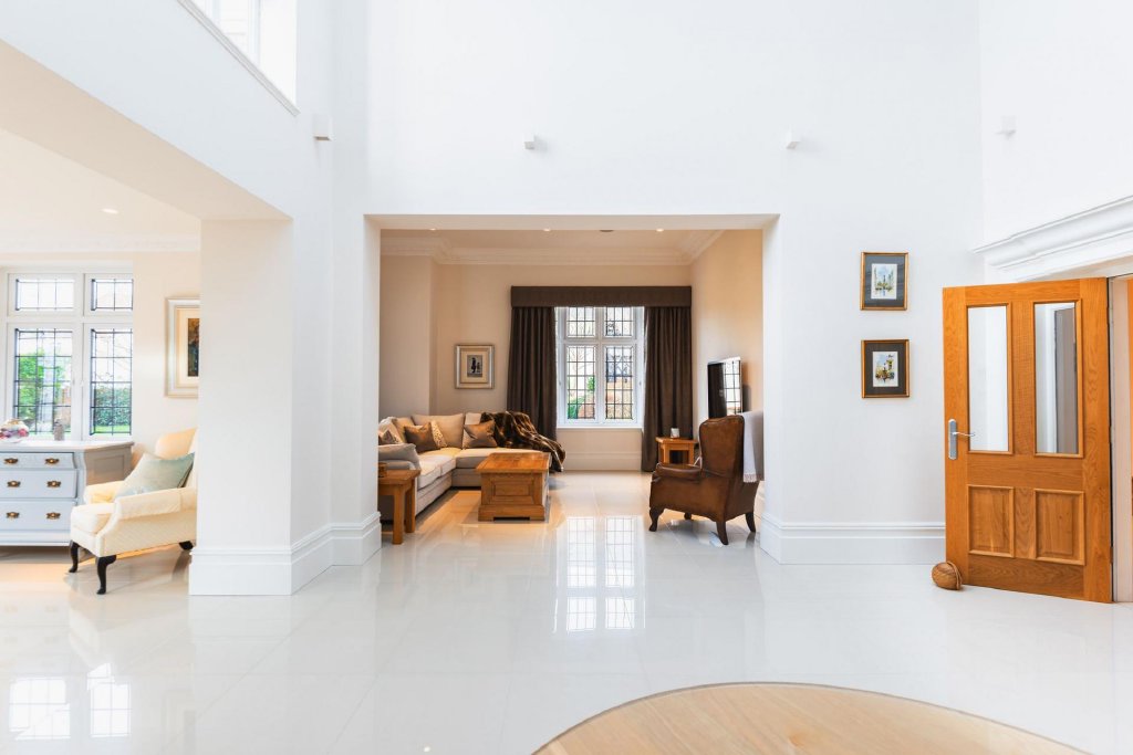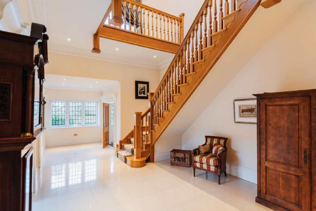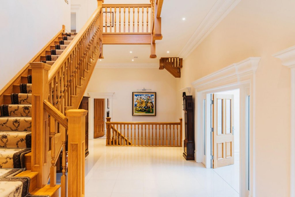 The ground floor continues to impress with a practical vestibule/porch, finished with elegant, tiled flooring leading to the grand reception hall with a double height ceiling and and striking Oak staircase.