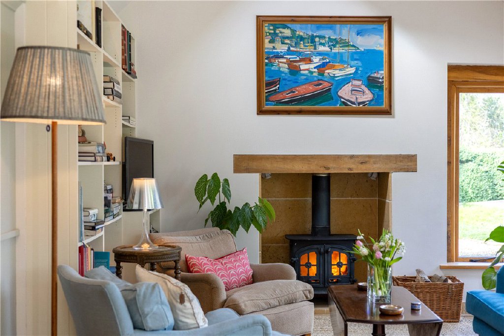 The heart of the home is the magnificent kitchen, dining and living area which cleverly combines a bespoke fitted kitchen with central island and an oak framed extension with picture windows offering stunning views over the mature garden in complete privacy. Vaulted ceilings make it light and airy and the wood burner provides a focal point to the room. The kitchen and living area benefit from underfloor heating. A larder leads off the kitchen.