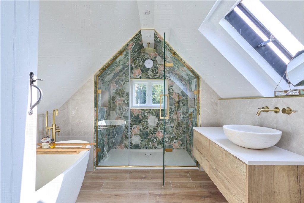 The first floor boasts four sizeable bedrooms. The original features on display are truly outstanding with original timber frames and exposed brickwork throughout. There are bathrooms at either end of the property. The principal family bathroom is abundantly stylish with a freestanding bath, double-sized shower, vanity sink unit, underfloor heating and WC. The guest bathroom enjoys a shower, vanity sink unit, WC and heated towel rail.