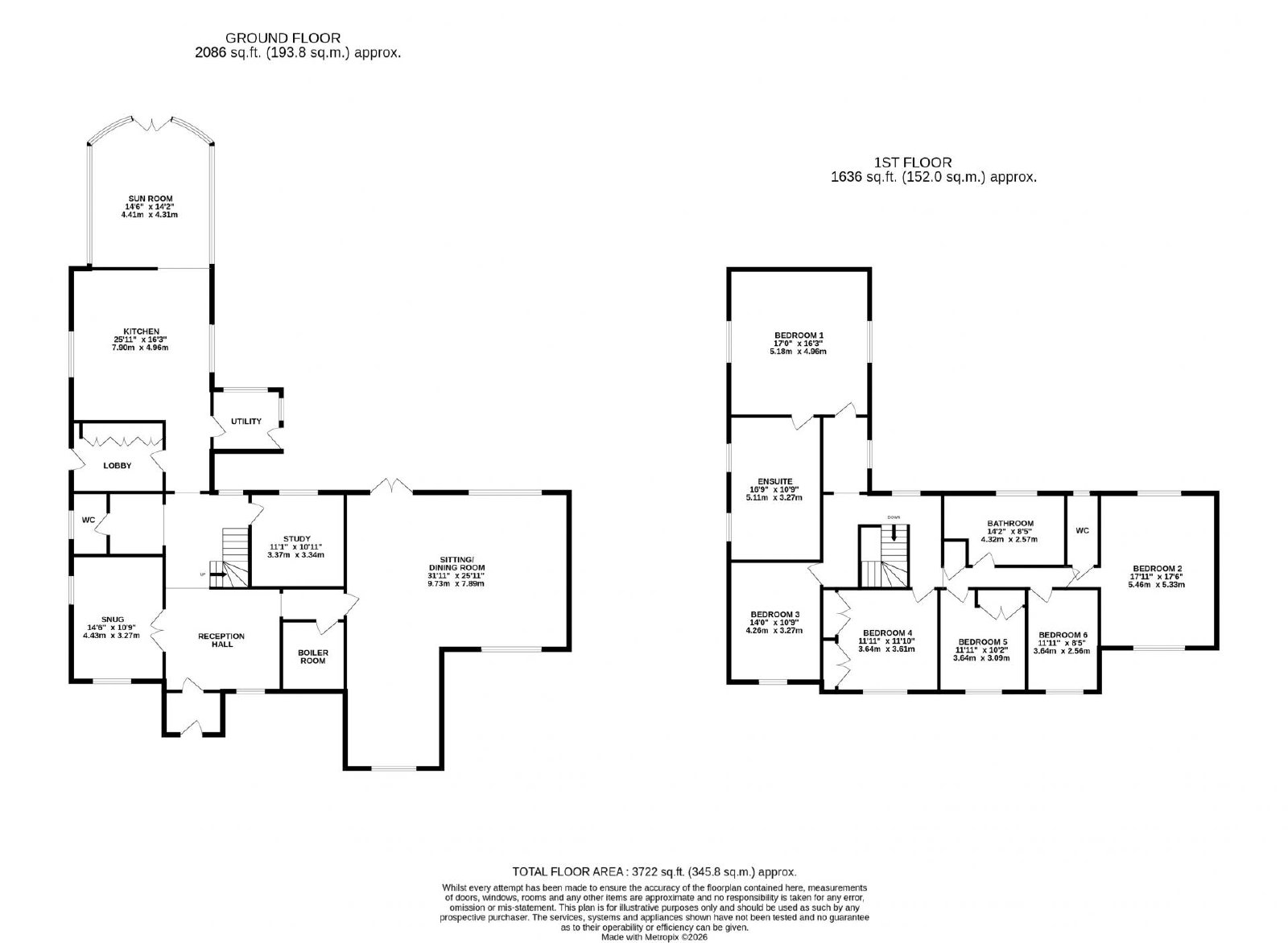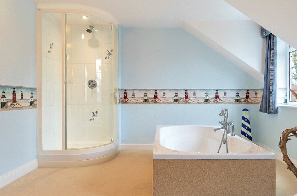 Upstairs, the accommodation continues to impress, with a private master suite featuring a four piece en suite, a further double bedroom with its own en suite WC, and four additional bedrooms served by a spacious family bathroom, offering exceptional versatility for family living or welcoming guests.