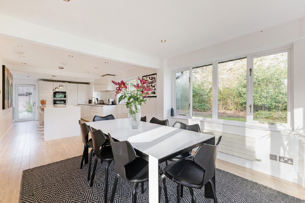 The main house is well-proportioned and designed for everyday living as much as entertaining. The kitchen sits at its centre, fitted with Corian surfaces, integrated appliances and a large island with breakfast bar. A generous dining space overlooks the south-facing gardens through French doors, and the reception room opens directly onto the wraparound hardwood terrace through a second set of French doors, making the connection between inside and outside a natural part of daily life.