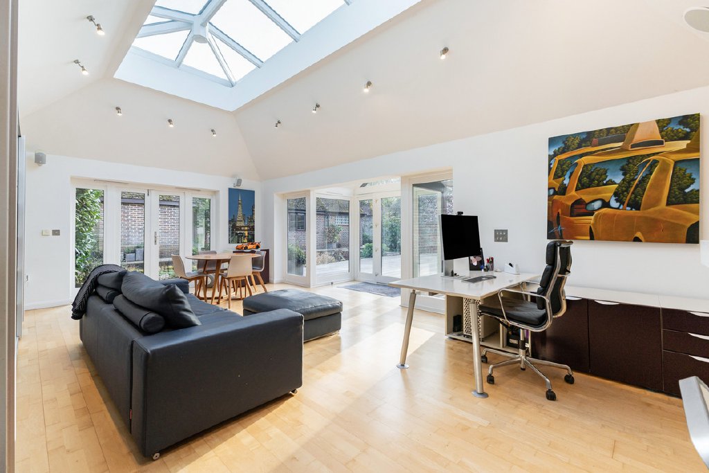 The single-storey annexe is self-contained and thoughtfully designed. A central lantern brings good natural light into the main reception space, which leads to a contemporary fitted kitchen with built-in appliances, a spacious double bedroom and a well-appointed shower room. Under the approved plans, this will be incorporated into the connected scheme alongside the existing home office, creating a flowing arrangement of accommodation that provides flexibility for how the finished home is used.