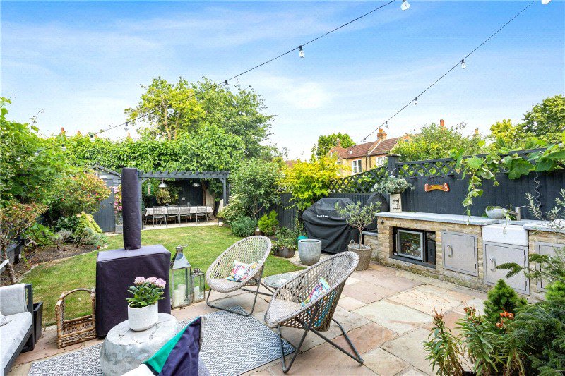 The rear garden is a true highlight, featuring a well-maintained lawn, mature plants, and a charming seating area, perfect for alfresco dining. The front garden includes off-street parking, adding to the convenience of this delightful home.