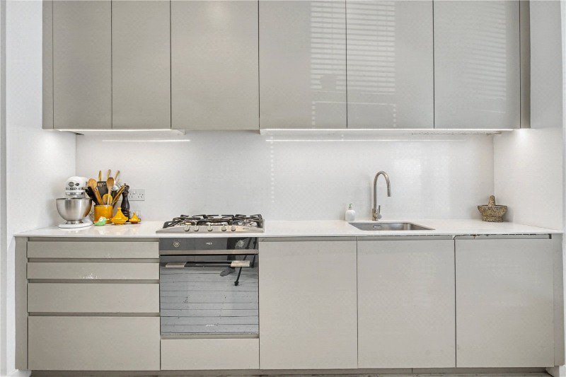 The kitchen is positioned at the front, while the rear opens into a large, light-filled space designed for dining, relaxing, and entertaining, with direct outlook and access to the garden.