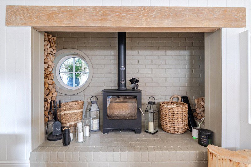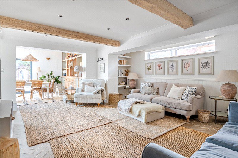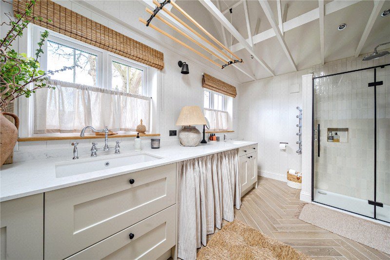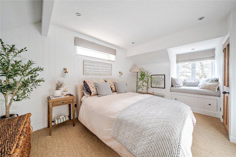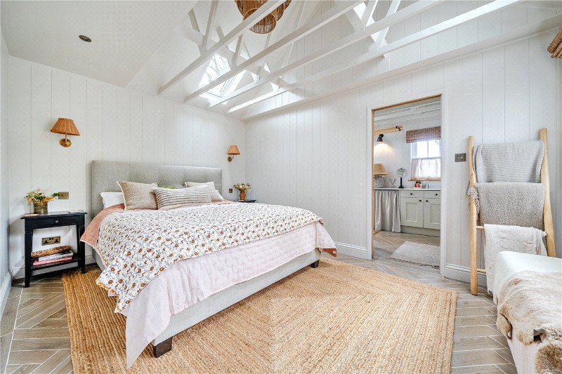 On the first floor, the generous principal bedroom benefits from a dressing room, while a second bedroom with built-in wardrobes sits alongside. Both rooms are served by a stylish, modern family bathroom. This level also offers a spacious landing and excellent storage throughout. The second floor provides further versatile living space, including a large bedroom or home office featuring beautiful wooden beams, as well as an additional bedroom with an en suite and abundant storage spaces.