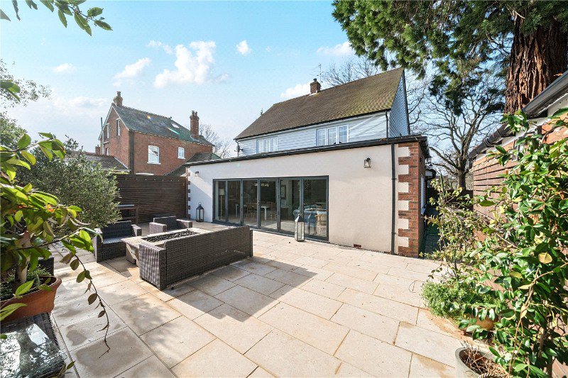 Set back behind a generous block-paved driveway providing ample off-road parking and access to a detached double garage, the house combines attractive brick and weatherboard elevations with well-balanced internal space. The property opens into a large, welcoming hallway which leads through to the hub of the home. The ground floor is centred around a superb open-plan kitchen/breakfast room, which flows into an exceptional family/dining room with roof glazing and wide bi-fold doors opening onto the rear terrace - creating a wonderful indoor-outdoor connection. A separate sitting room offers a more formal reception space, while a ground floor bedroom, with incredible vaulted ceilings and wooden beams and its own en suite shower room, provides flexibility for guests or multi-generational living. A utility area and downstairs WC complete this ground floor layout.