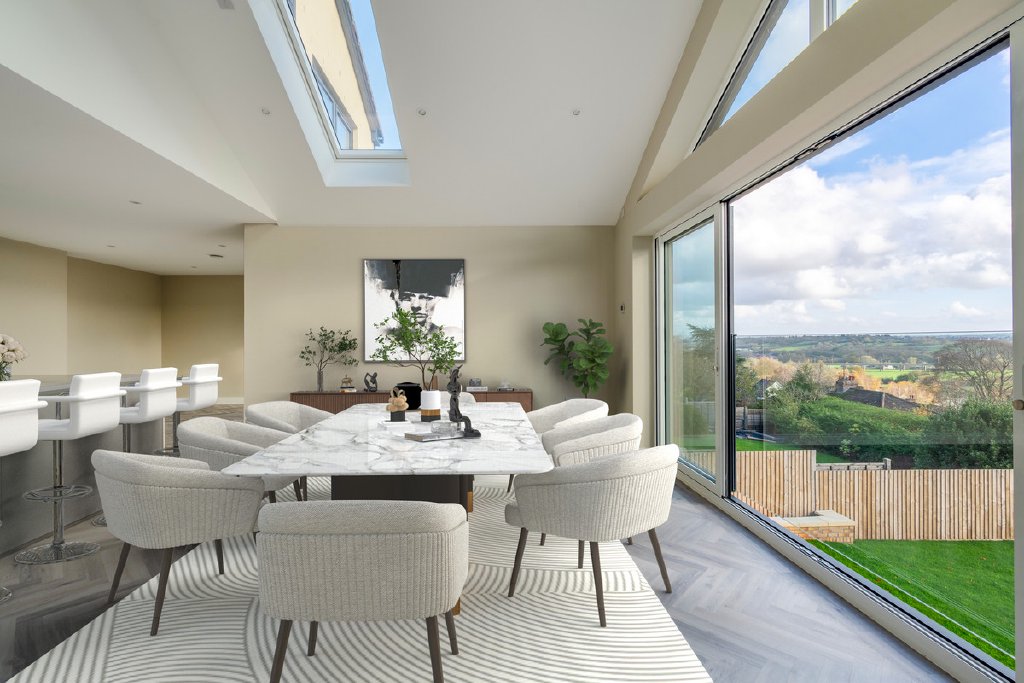 - Stunning kitchen/family room, luxury Neff appliances, large island table, full height sliding doors open to breathtaking countryside views