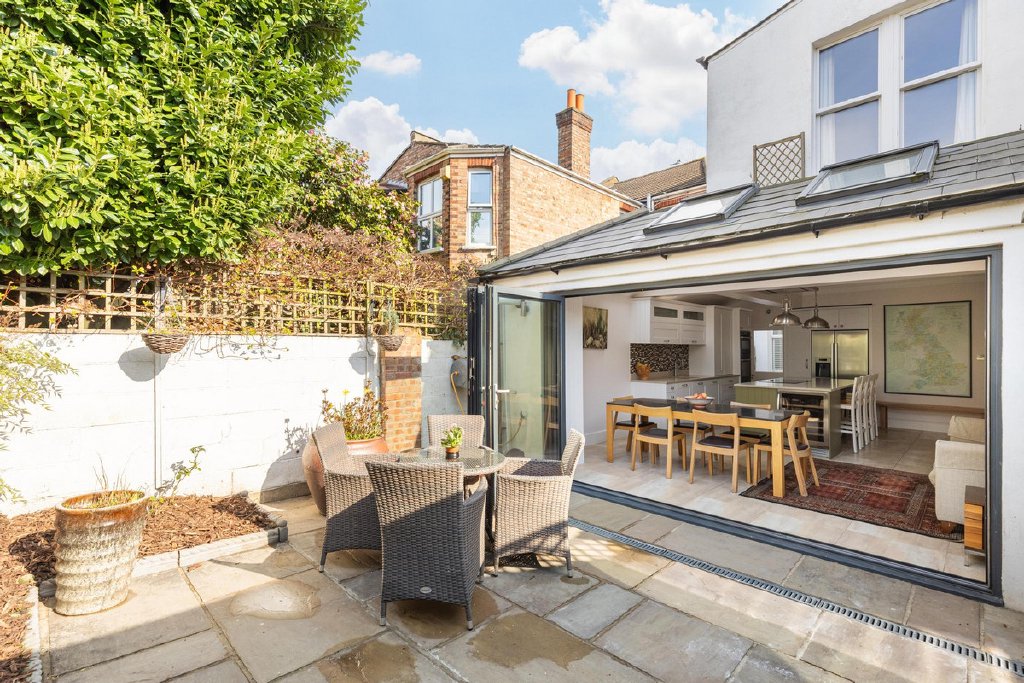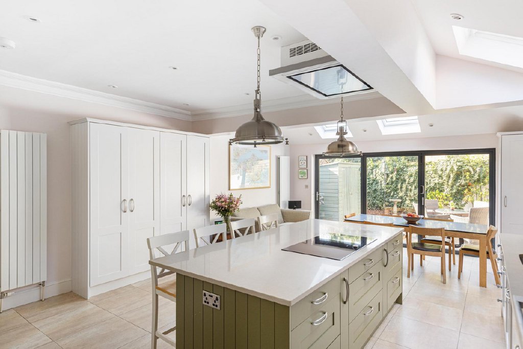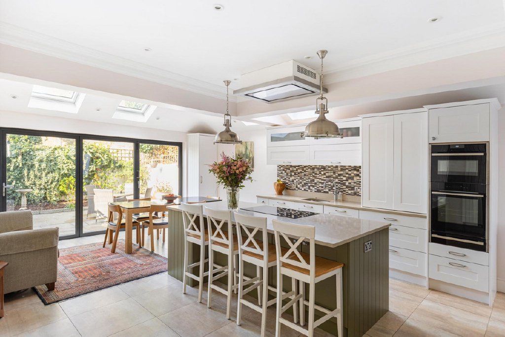 To the rear, the property opens into a magnificent, fully extended kitchen, now undoubtedly the heart of the home. Designed with both practicality and style in mind, it features extensive bespoke storage, a substantial central island and a dedicated dining area, perfectly suited to modern family life. Bathed in natural light from an array of skylights, this impressive space enjoys a seamless connection to the outdoors via bi-fold doors, which open onto a beautifully maintained, low-maintenance garden enjoying a sunny aspect, ideal for al fresco dining and summer gatherings.