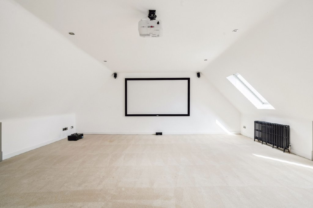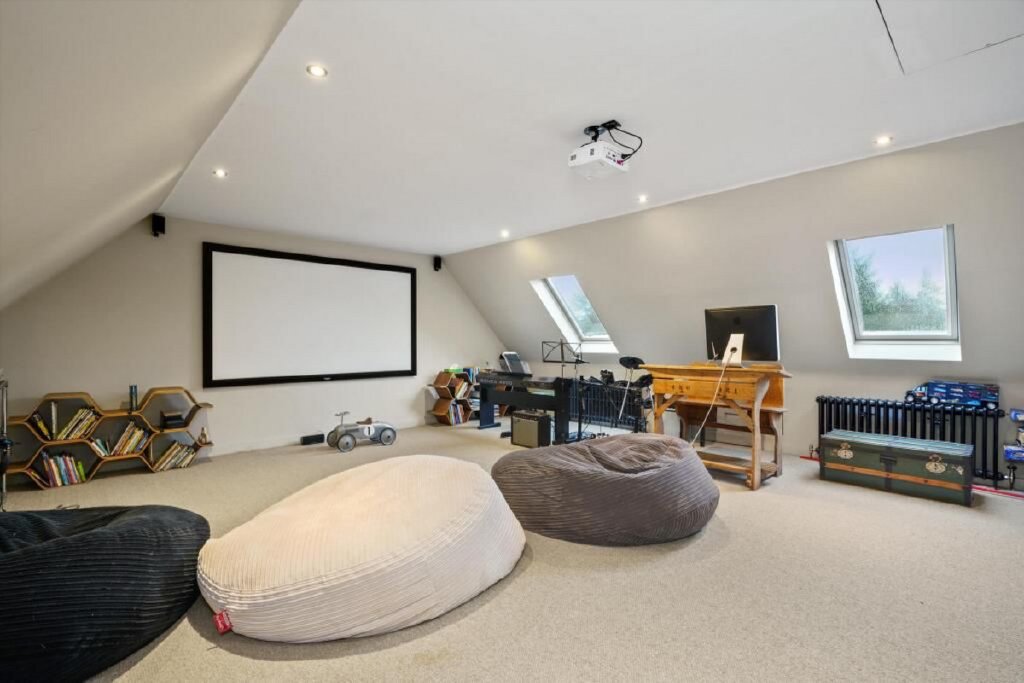 Upstairs, the impressive principal suite offers a true retreat, complete with a luxurious four-piece en suite bathroom and walk-in wardrobe. Five further double bedrooms, each with their own en suite, ensure outstanding accommodation for family and guests alike. The second floor adds yet another dimension, featuring a superb games room with projector screen — perfect for cinema nights or entertaining — alongside an additional double bedroom and bathroom.