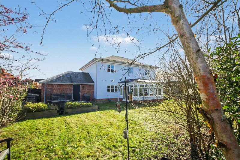 Outside, the rear garden has been thoughtfully arranged to provide both privacy and enjoyment throughout the day. A generous lawn is framed by established planting and mature boundaries, while a paved terrace creates the perfect setting for outdoor dining and entertaining. The garden also provides direct access to the double garage.