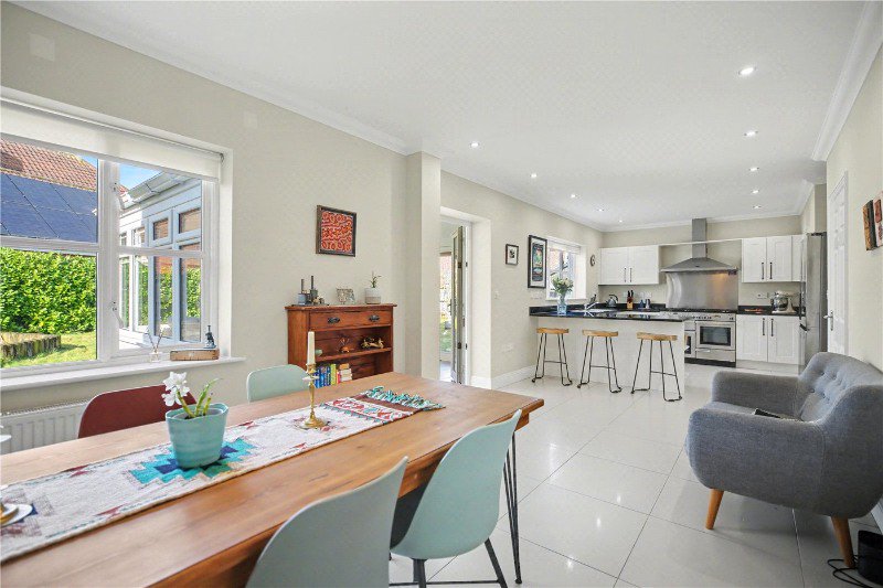 The sitting room is an elegant double-aspect space filled with natural light, centred around a contemporary fireplace which creates a warm focal point. Positioned to the rear of the property, the impressive 33ft kitchen, dining and family room forms the true heart of the home. This expansive open-plan area offers exceptional versatility, with ample space for cooking, dining and relaxed seating, all while enjoying views over the garden. The kitchen itself is well appointed with integrated appliances, generous preparation space and a separate utility room positioned conveniently alongside.