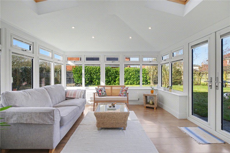Extending from the main living space is a beautifully bright garden room. With glazing on three sides and doors opening directly onto the terrace, it provides a wonderful place to enjoy the garden throughout the seasons while allowing the outside space to feel closely connected to the home.