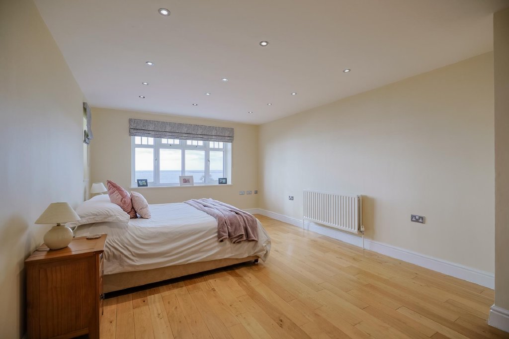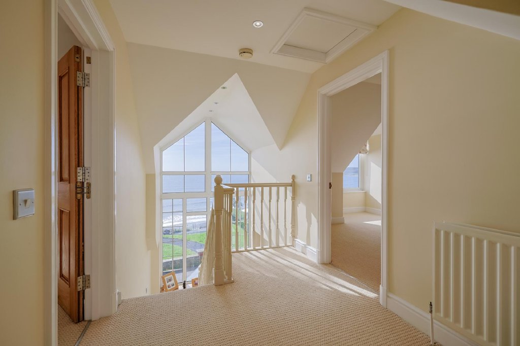Ascending the oak staircase, the first floor landing is bright and airy, enhanced by a stunning double-height apex window to the front showcasing spectacular sea views. With oak flooring and spotlighting, this space provides access to three bedrooms, the family bathroom and stairs to the second floor.