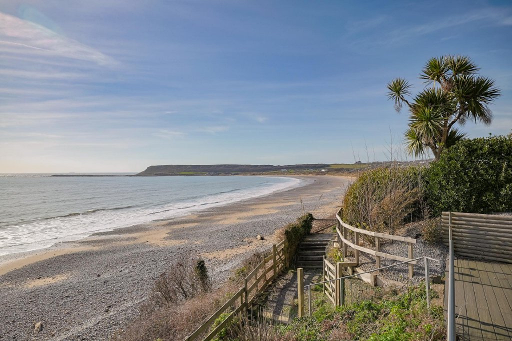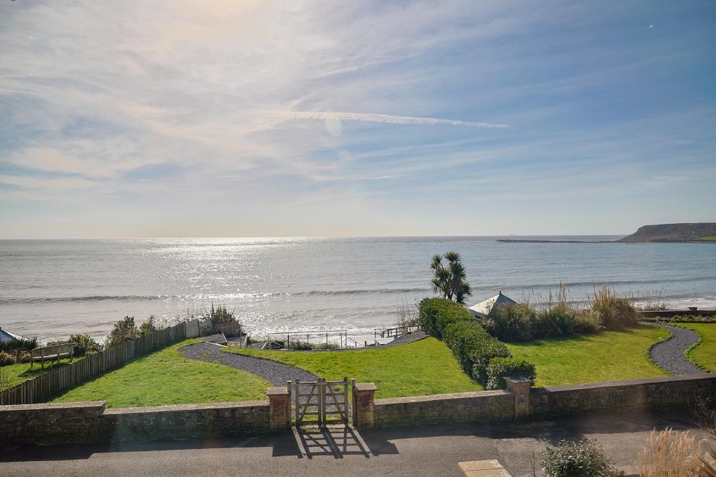 After travelling along South Gower Road and through the picturesque village of Horton, you arrive at this remarkable beachfront home, immediately struck by its stunning setting. The sense of peace is instant, with nothing but the sound of waves and the ocean beyond—simply beautiful. A double iron gated entrance opens onto a brick paved driveway providing parking for three vehicles, and steps lead you up to the entrance porch, warmly inviting you into this exceptional home.
