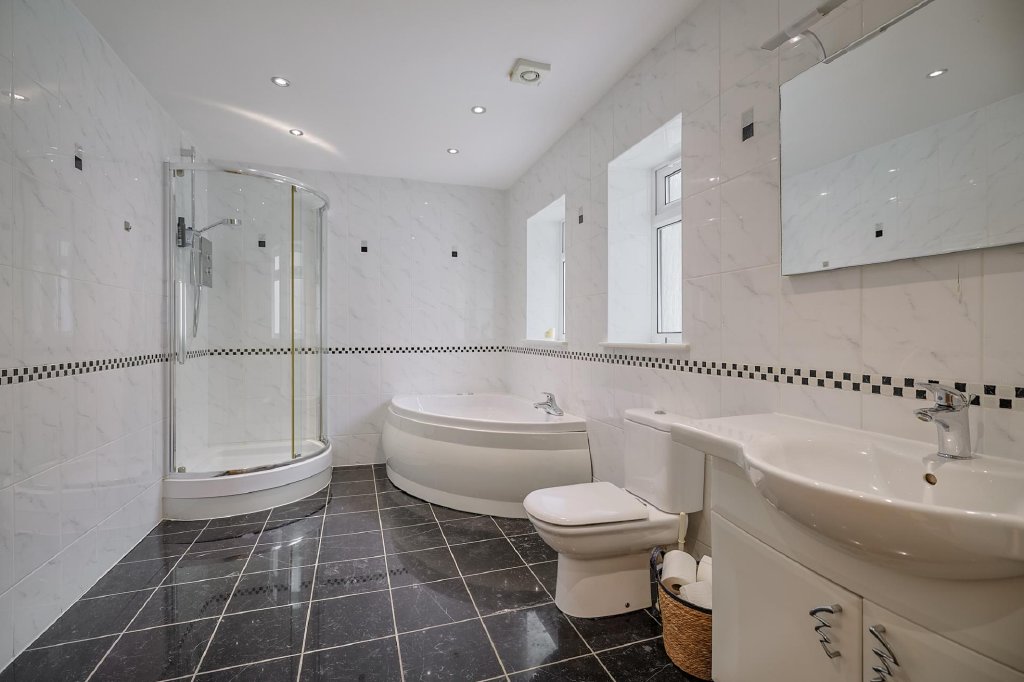 The family bathroom is well-appointed, featuring a WC, wash basin with storage underneath and a large, fitted corner bath. In addition, there is a separate electric shower cubicle, tiled flooring, tiled walls, spotlighting, an extractor fan, and two frosted window to the rear.