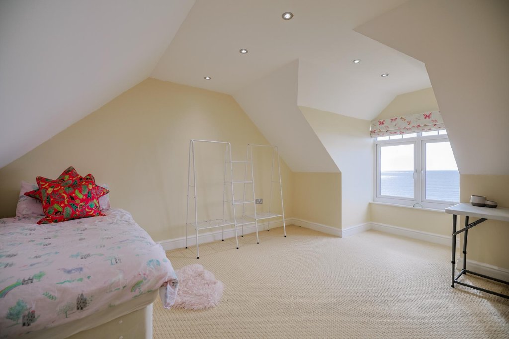 Ascending to the second floor, the landing is bathed in natural light from a striking apex window, again showcasing those incredible coastal views. This level offers two further bedrooms, a bathroom and two large storage cupboards.