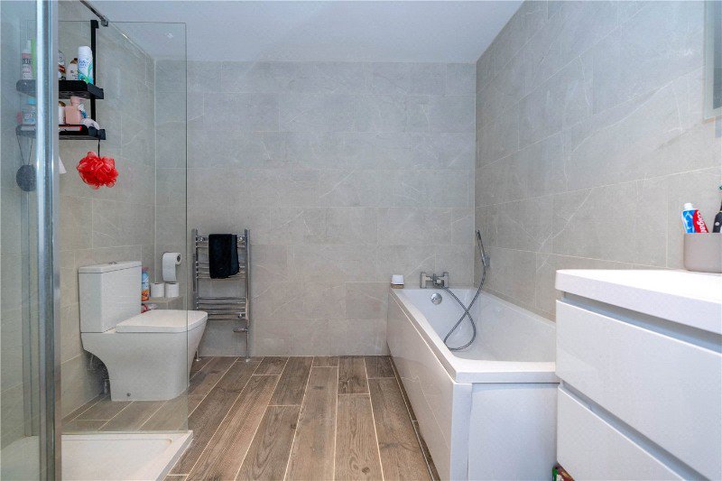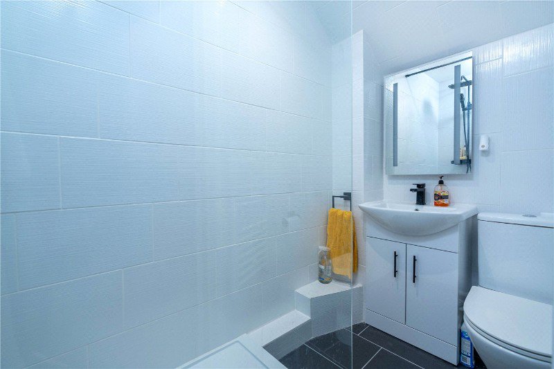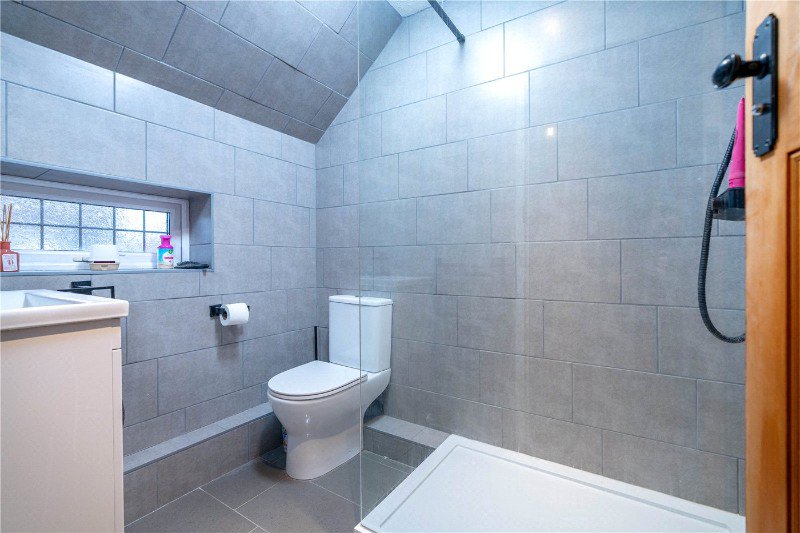 With frosted UPVC window to the front aspect, comprising a refitted three-piece suite, low level WC, wash hand basin set in vanity unit and double shower with rain shower over, fully tiled walls, tiled flooring and heated towel rail.