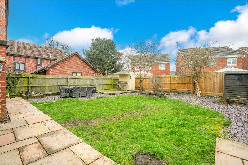 Set toward the end of a popular enclave a few minutes from wide open greens, ideal for dog, the attractive frontage is open, and block paved to extend the off-road parking to three, leading to a SINGLE GARAGE 18'10 x 9'2 with up and over door, power and light connected. The rear gardens enjoy a westerly facing aspect, and are enclosed by fencing mainly laid to lawn, set to entertain family and friends, extended patio seating, raised decking and timber bar, with slate beds and shrub borders.
