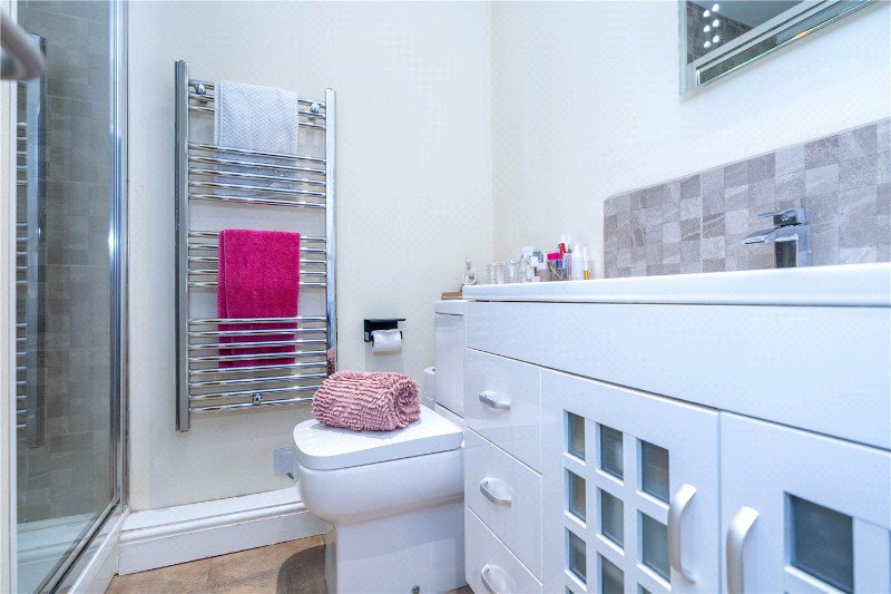 Comprising a three-piece suite, low level WC, wash hand basin set in vanity unit and corner shower cubicle with rain shower over, chrome heated towel rail, ceiling spotlights and tiled effect flooring.