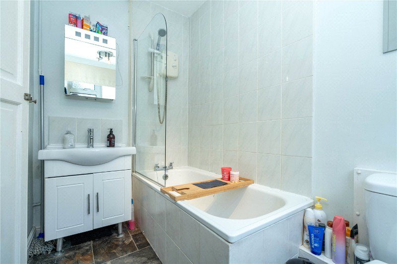 With frosted UPVC window to the rear aspect, low level WC, wash hand basin set in vanity unit and tiled panel bath with wall mounted electric shower over, chrome towel rail and tiled effect flooring.