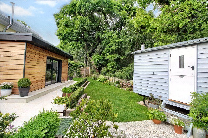 The stunning garden has been professionally designed and landscaped. Offering a high level of privacy and backing onto protected private woodland this gardens privacy won't be beaten! The Italian stone patio provides the perfect place for alfresco dining and for enjoying the summer weather. The manicured lawn wraps around the home and modern planting is found within the garden. A striking Shepherds Hut built by the ‘English Shepherd hut company’ is found within in garden and would make the perfect home office or additional bedroom.