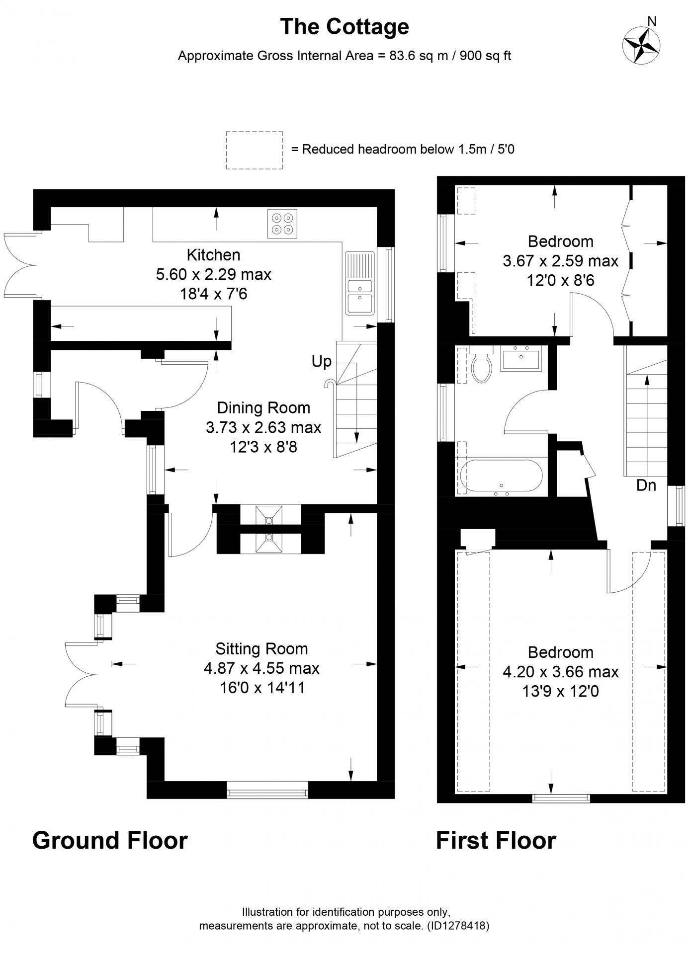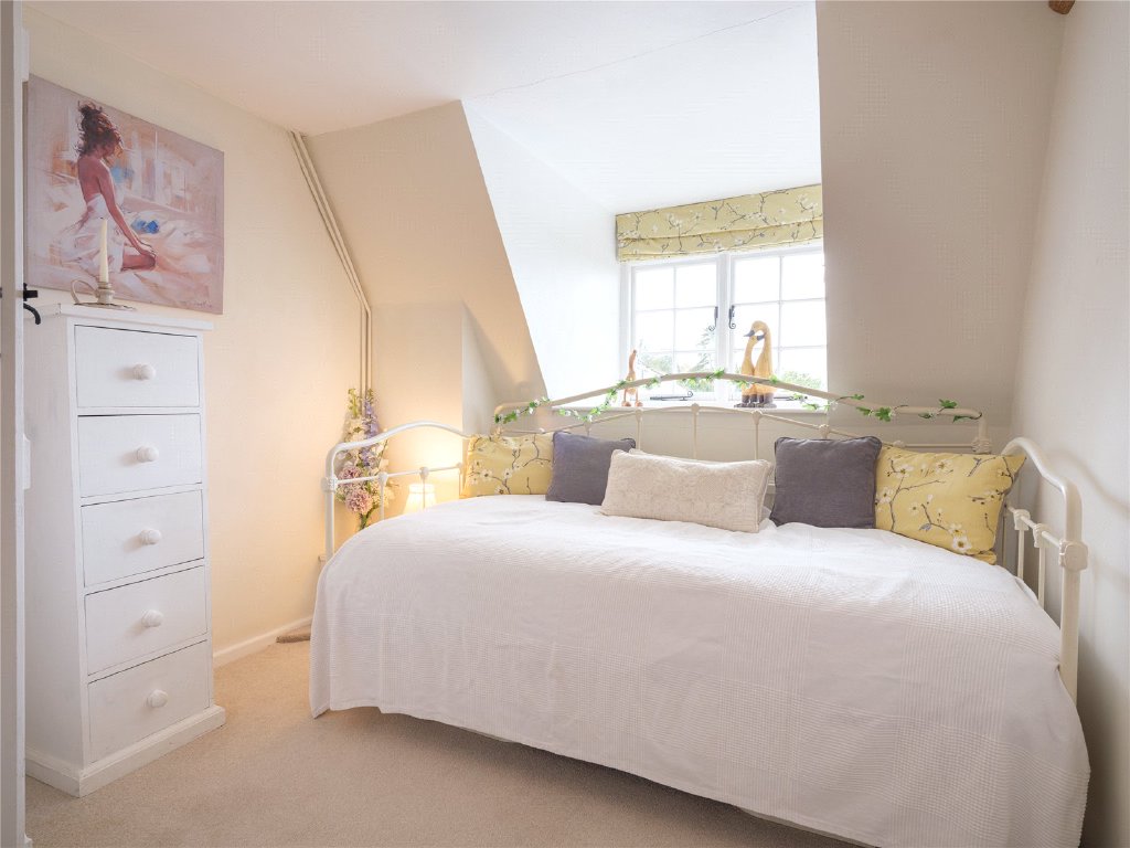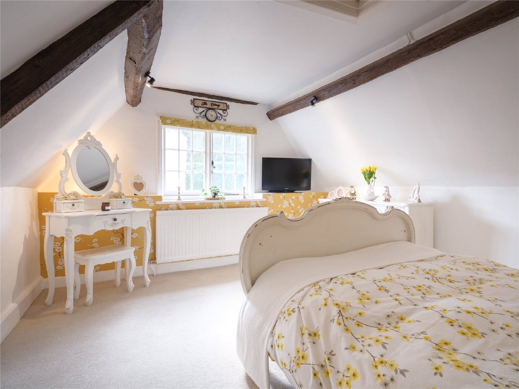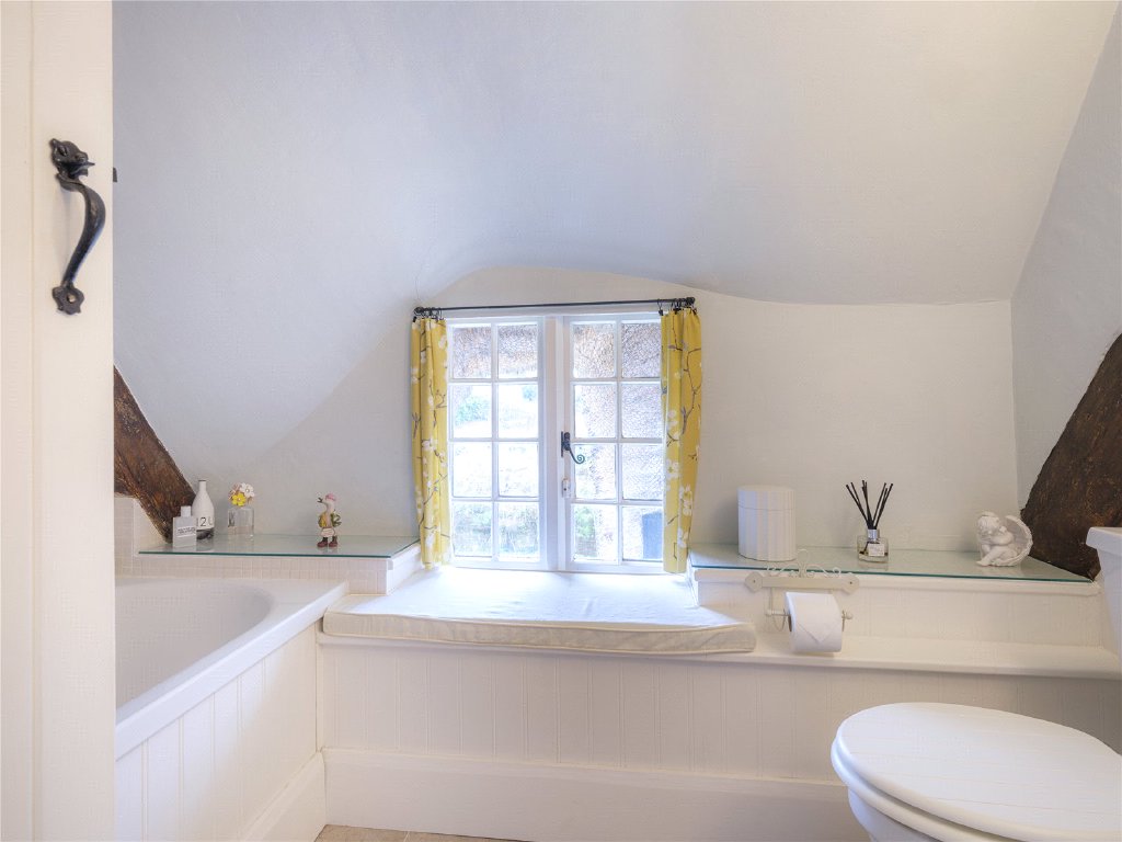Two good sized double bedrooms, both benefit from fitted storage. The main bedroom is a particularly good size, again with exposed wooden beams, whilst the second has a wonderful view out across the village to the surrounding countryside. The bathroom sits between the two bedrooms and has a charming window seat next to the bath with shower over.