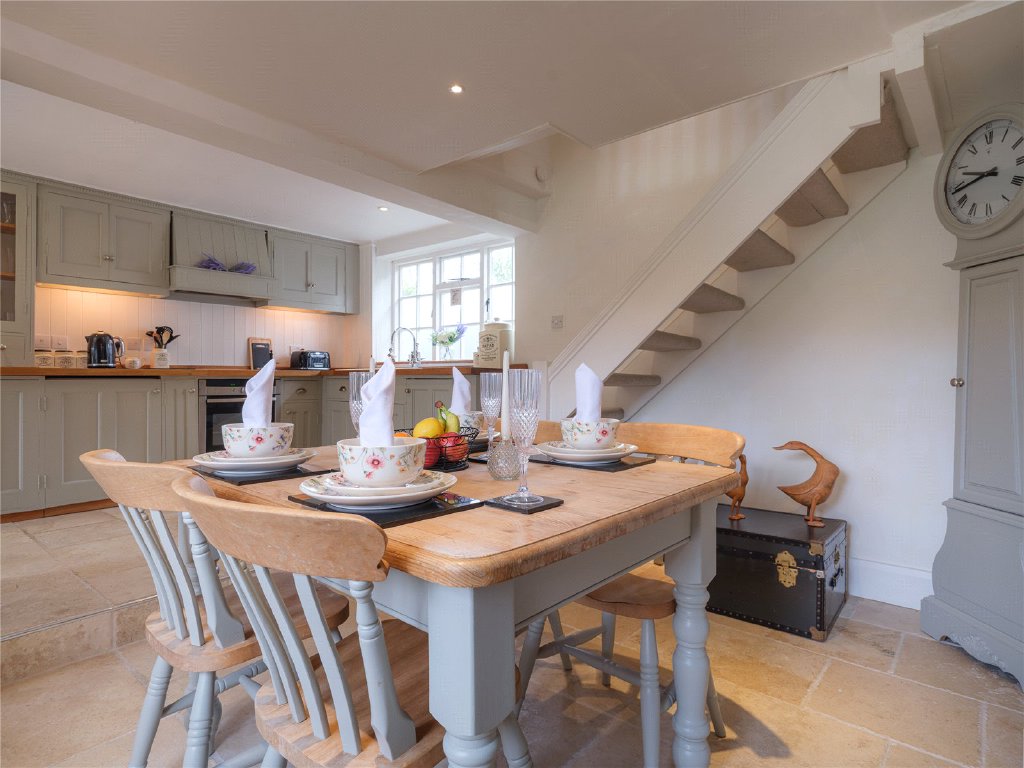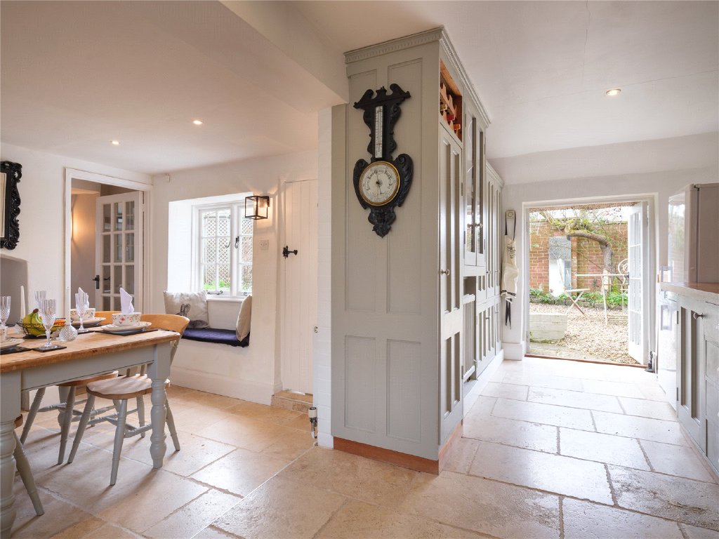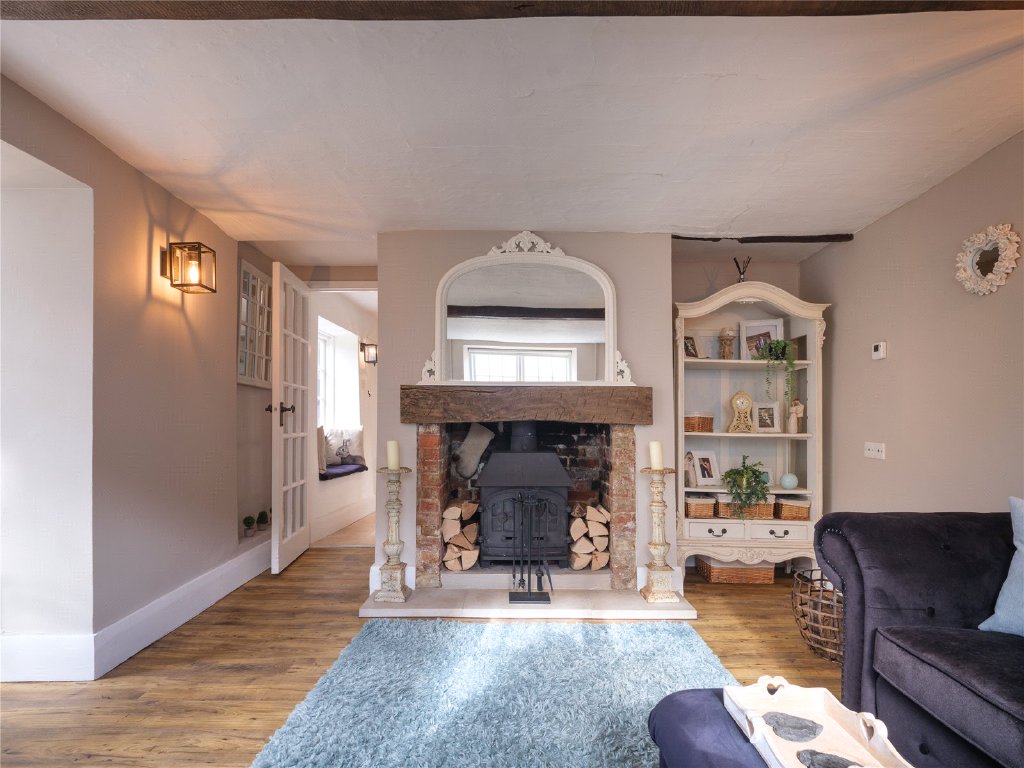 The entrance hall provides useful storage as you enter the cottage and leads to the welcoming kitchen and dining area. The well planned bespoke kitchen features solid wood work surfaces and flagstone flooring, reflecting the light throughout this charming and sociable space. In the summer months throw open the double doors to give access to the gravelled seating area, perfect for a morning coffee or glass of wine in the late afternoon sunshine. A sweet window seat in the dining area is a gorgeous feature. Good ceiling height, often a rarity in cottages of this age continues through to the sitting room, with a cosy log burning stove, perfect for a winter's day, exposed wooden beams and another set of double doors to the garden for the warmer months.