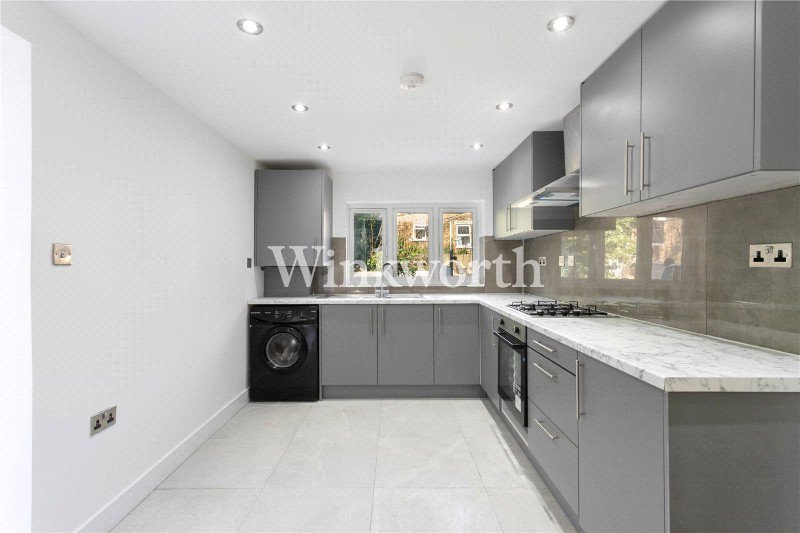 To the rear, the kitchen has been newly fitted with modern cabinetry, and integrated appliances. The room offers excellent worktop space and storage, with windows overlooking the garden bringing in plenty of natural light. There is also a ground floor WC on this level.