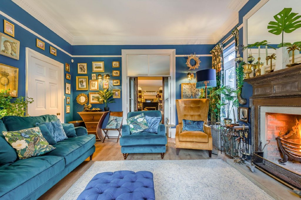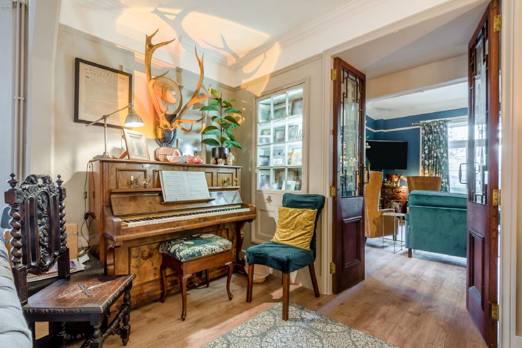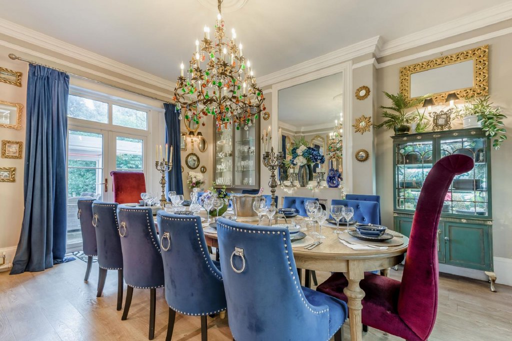The formal dining room looks out to the gardens through a pair of glazed double doors with original period shutters. There is an impressive open stone-built fireplace and fitted glazed display cabinet to one wall.