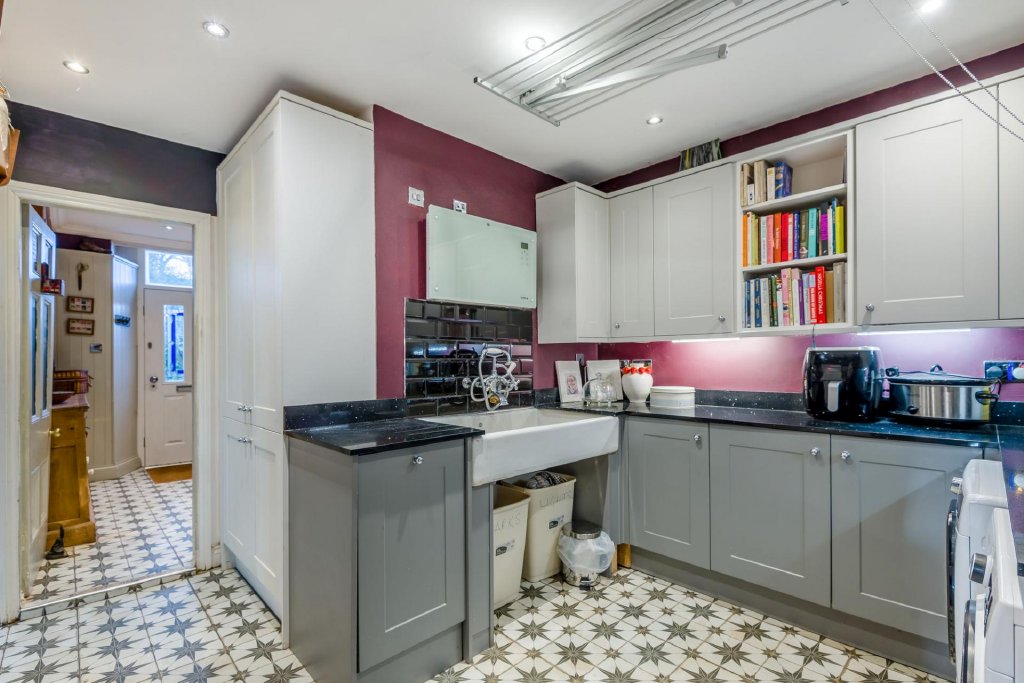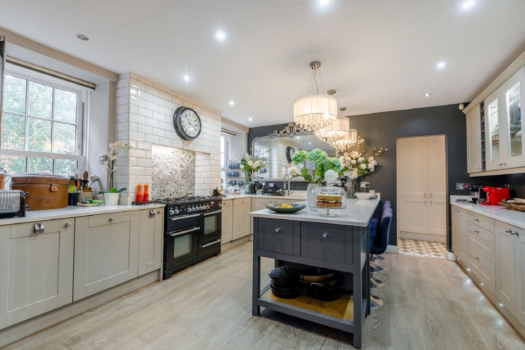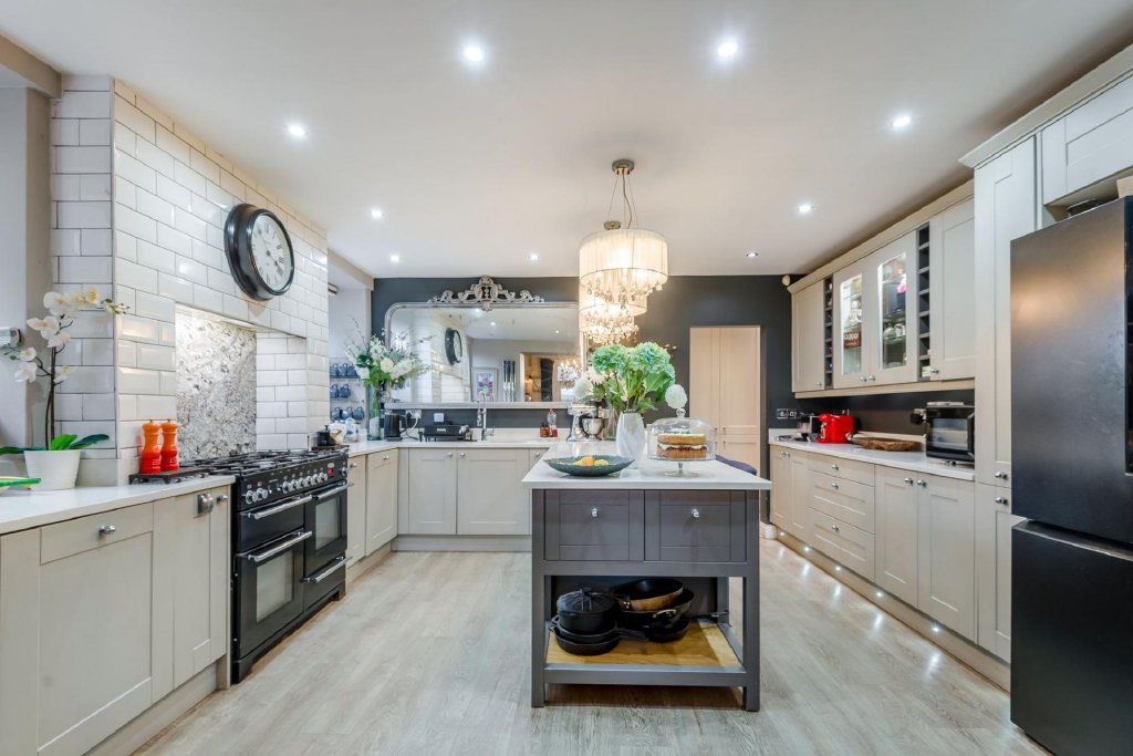 The impressive kitchen was renovated a few years ago to an exceptional standard, and opened up to create a spacious kitchen-dining room ideal for entertaining, and which can be separated if desired by large curtains. The shaker style kitchen oozes contemporary style whilst remaining very much in-keeping with the character of the house and enjoying wonderful views across the two front lawned areas and countryside beyond. There are beautiful white marbled quartz worktops and a granite splashback behind the range and plenty of fitted storage cupboards. There is a breakfast bar, Rangemaster cooker with gas hob and hot plate above, two integrated wine racks, contemporary style radiators, attractive hanging light fixtures and two windows looking out to the courtyard.