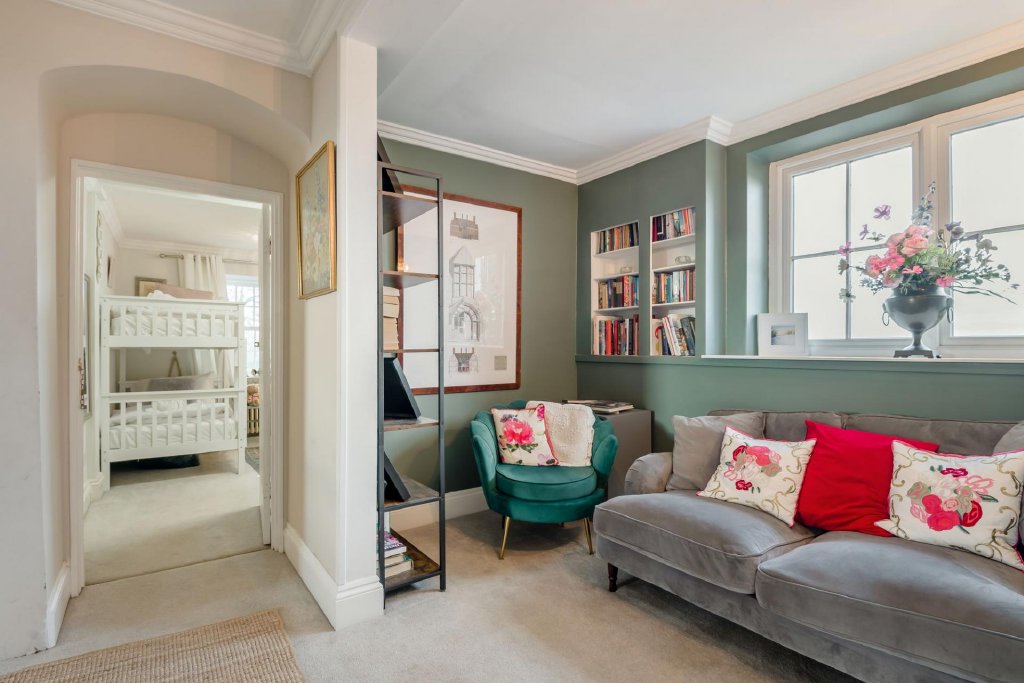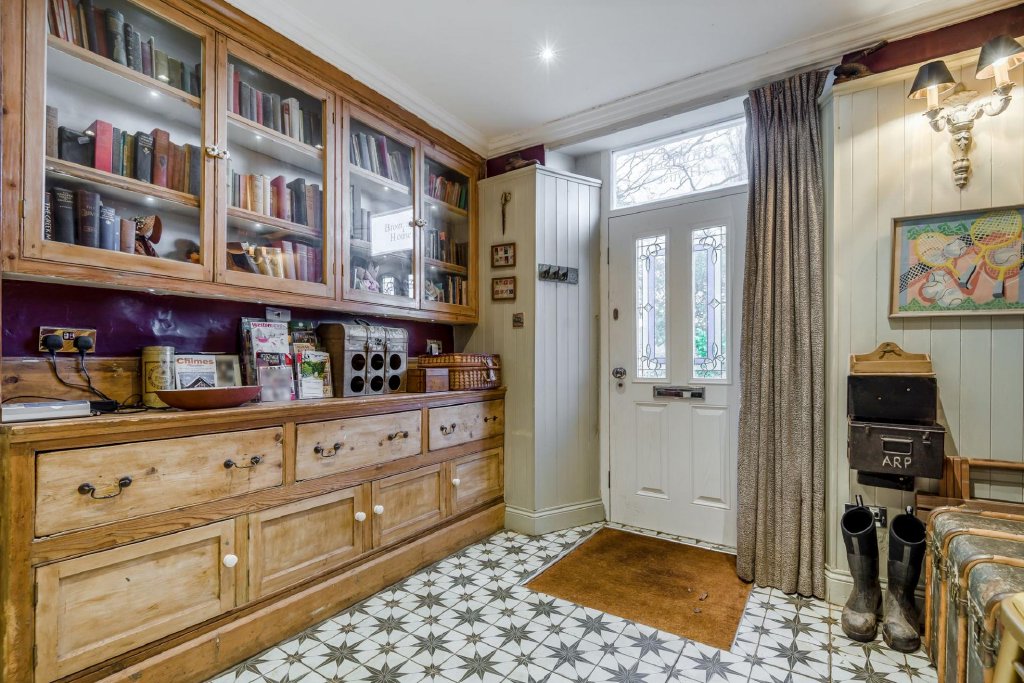 The lounge is another large and inviting reception room, with an open fireplace, large square bay window to side courtyard, fitted bookshelves, two glazed display cabinets and a door leading back to the reception hallway.