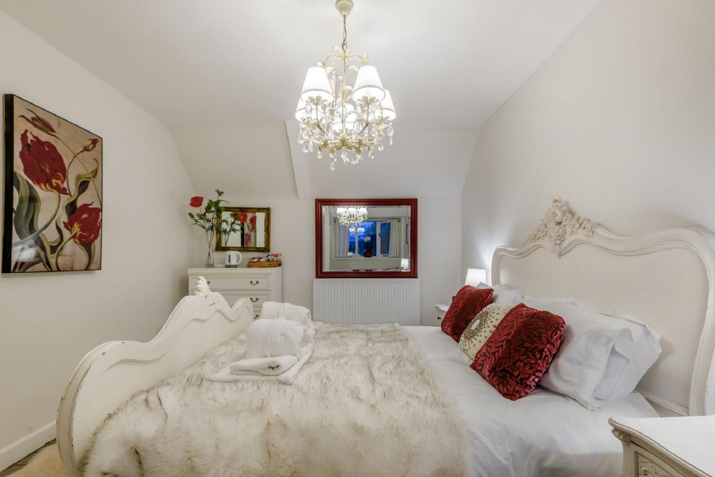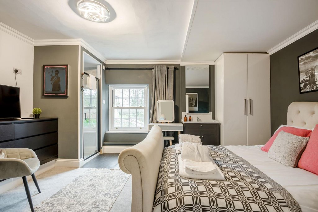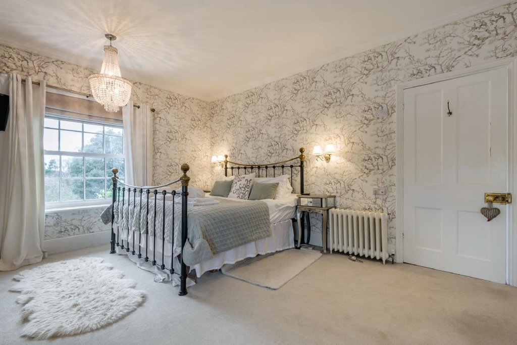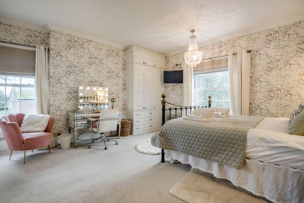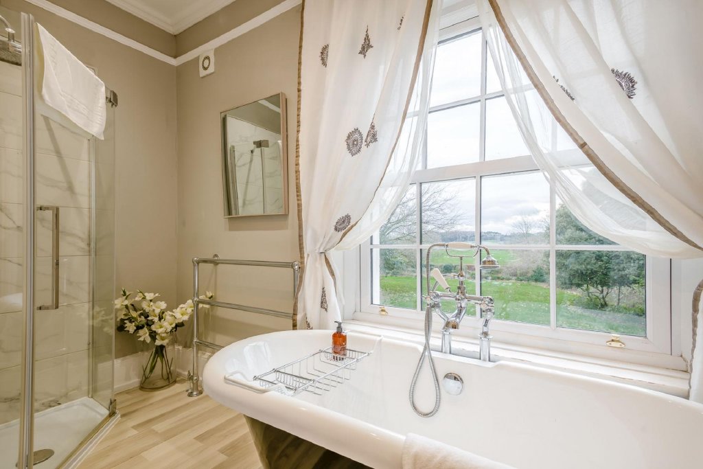 There are five double bedrooms in total to the first floor. The master bedroom is particularly beautiful, with numerous character features to include a black iron fireplace with attractive surround and a glazed wall cabinet with traditional column style radiator beneath. The en-suite bathroom is separated from the bedroom area with curtain divide through a pillared archway, with a roll top bath enjoying beautiful views of the gardens and countryside beyond. There is a separate shower unit, wall mirror and heated towel rail and a door to cloakroom with wc and wash hand basin.
