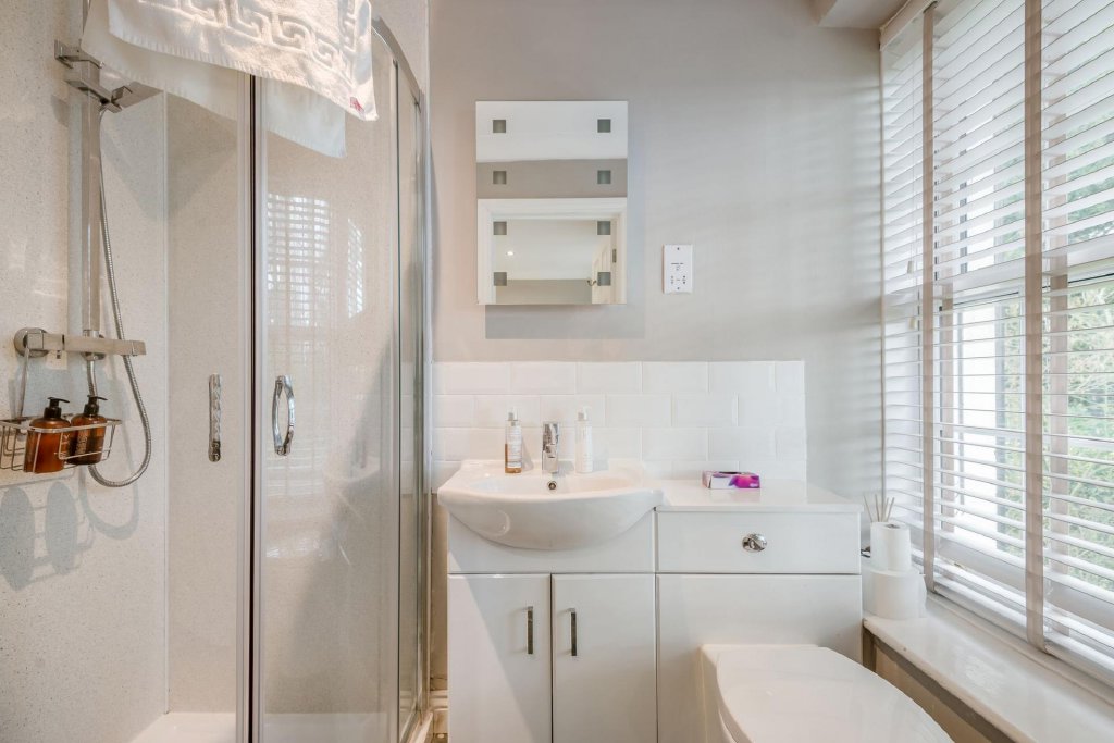 The family bathroom is particularly appealing, being tastefully presented with attractive wall tiling, views through shuttered windows, panelled bath with overhead rain shower attachment, vanity wash hand basin with fitted mirrored cabinet above, wc and heated towel rail. This bathroom is also directly accessible via one of the larger bedrooms.