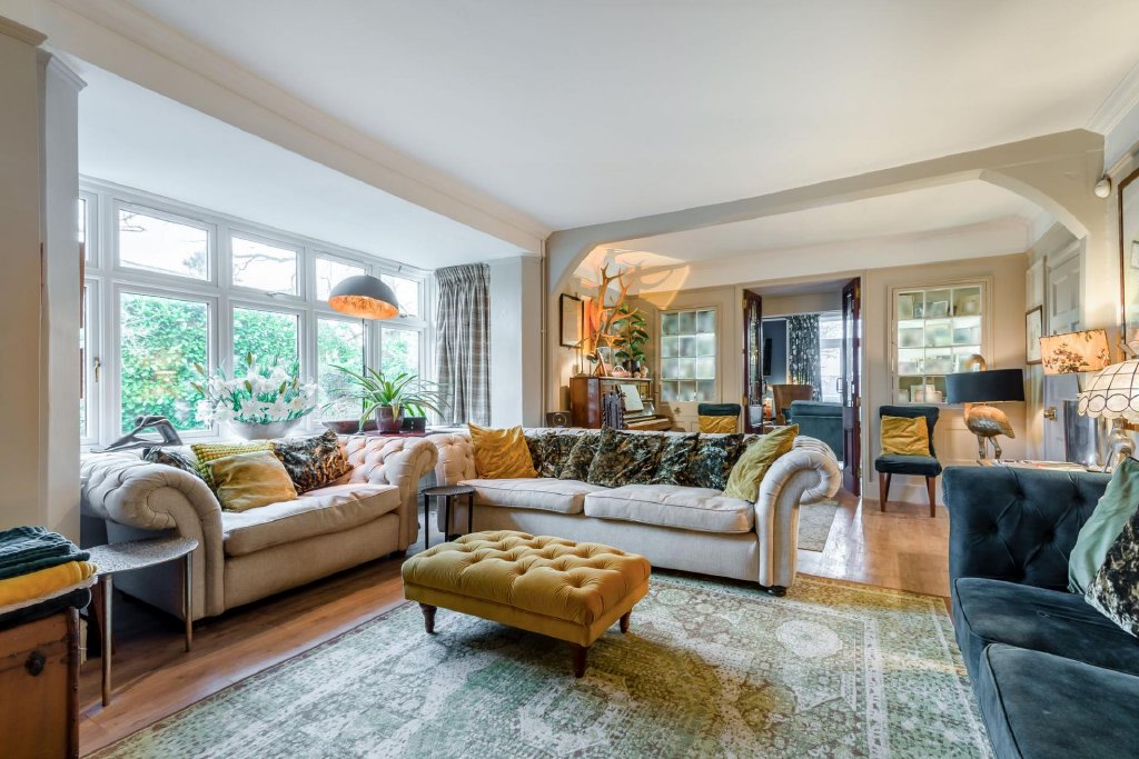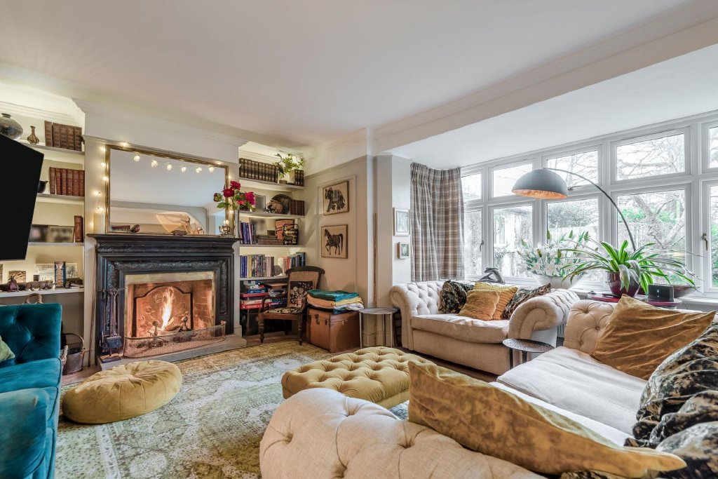 The drawing room is a fantastic reception room with high ceiling and glazed double doors to two aspects with garden views. There's an attractive open fireplace and refurbished original radiators. A pair of double doors lead through to the lounge, with the option of separating the two rooms completely with a closing mirrored 'false wall'.