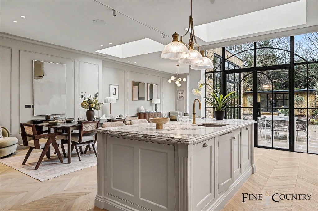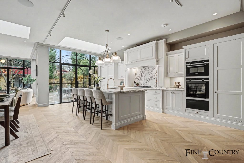 To the rear, the house opens into a substantial open-plan kitchen, dining and living space forming the heart of the home. Extended as part of the renovation, the room benefits from ceiling heights of approximately three metres together with large rooflights which introduce natural light from above. Full-height steel-framed heritage glazing with distinctive arched detailing opens directly onto the garden, creating a strong architectural focal point and establishing a seamless connection between interior and exterior space.