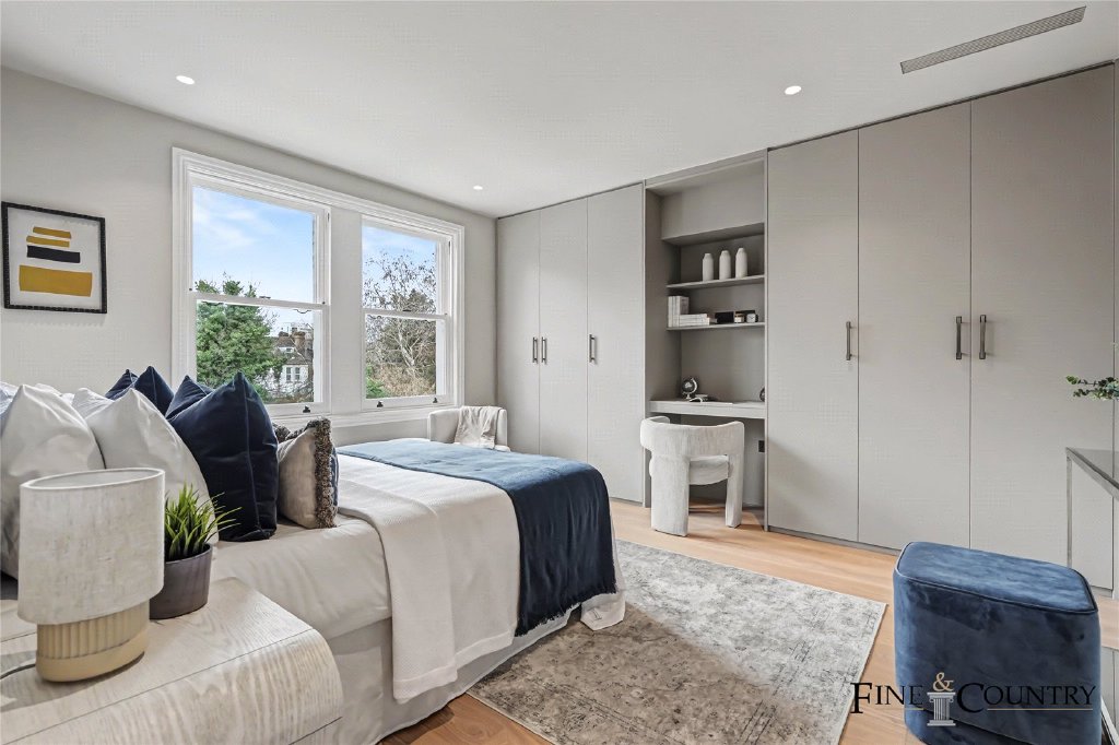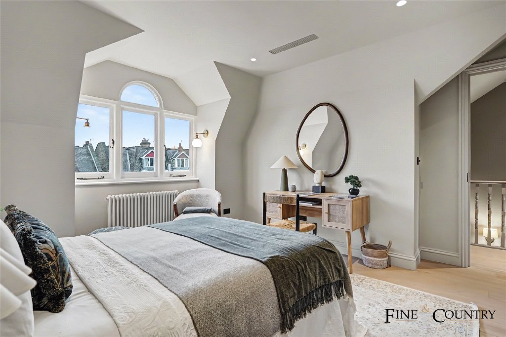 The upper floor provides two further double bedrooms arranged around a central landing. Both rooms are well-proportioned and benefit from good natural light through dormer and sash windows. The consistent neutral palette and bespoke storage maintain the calm architectural character established throughout the house.