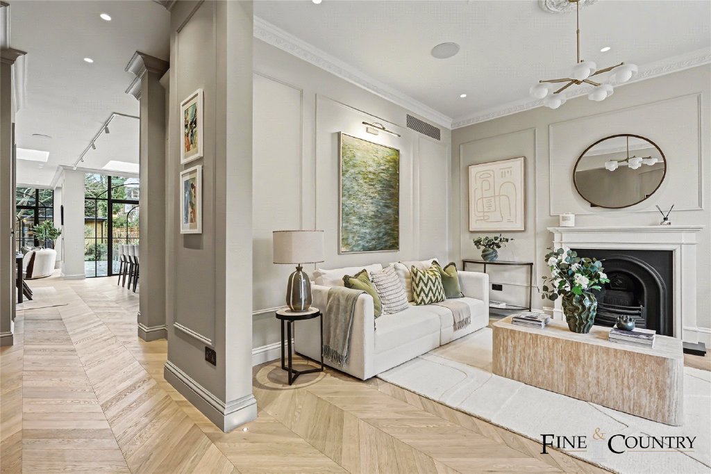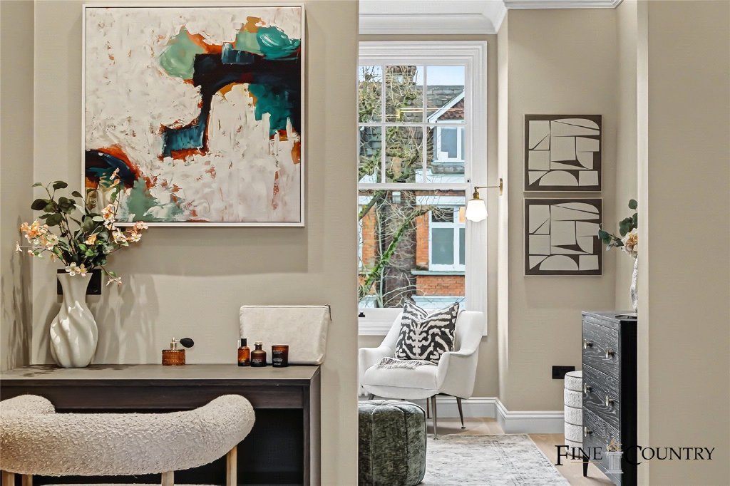 To the front sits a beautifully proportioned formal reception room centred around a restored marble fireplace and flanked by tall sash windows. Panelled walls and traditional joinery reinforce the period character while maintaining the calm and cohesive decorative scheme established throughout the house.
