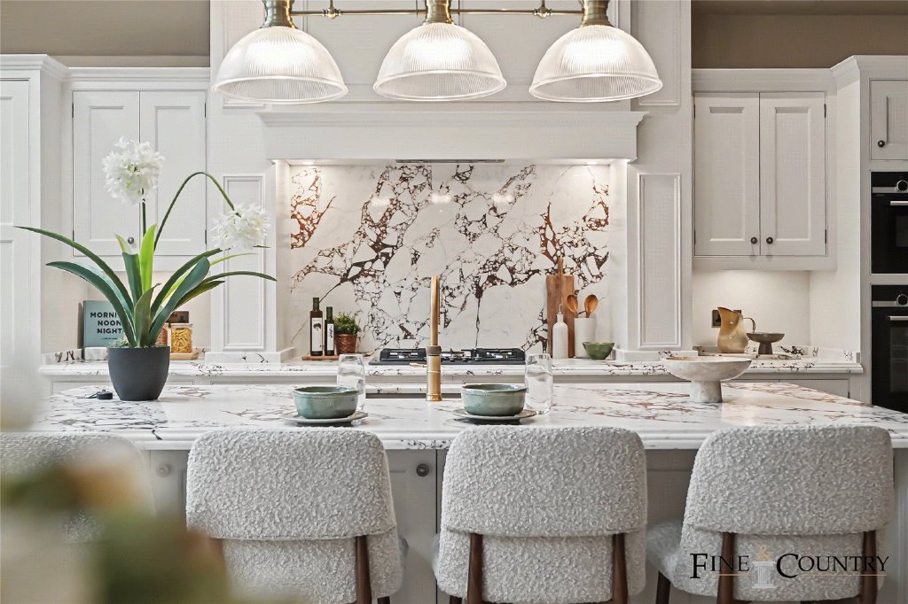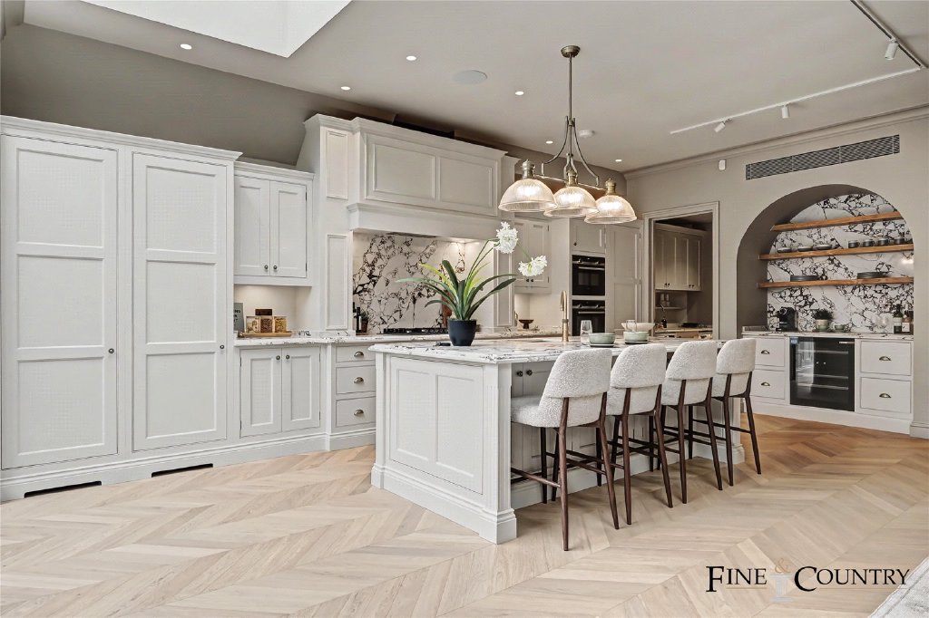 At the centre of the room sits a handcrafted kitchen by Tim Cook, designed as both a working kitchen and a social space. Hand-painted cabinetry is complemented by natural stone worktops and a dramatic full-height stone splashback, while a large central island provides additional preparation space and informal seating. Integrated appliances are concealed within traditional cabinetry, maintaining the clean architectural lines of the space.