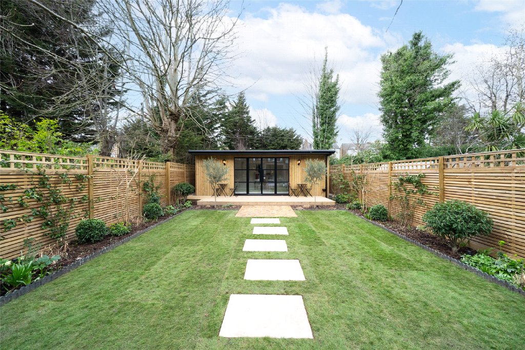 The rear garden has been carefully landscaped to create a structured and visually balanced outdoor setting. A broad stone terrace sits immediately outside the kitchen and reception space, ideal for outdoor dining and entertaining. Beyond, a central stepping-stone pathway leads through planted borders toward a substantial detached garden studio positioned at the end of the plot.